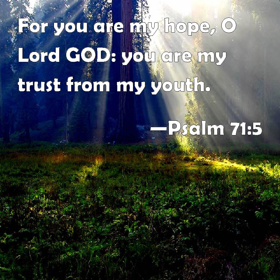 Choose a Background Psalm 71:5 For you are my hope, O Lord GOD: you are my trust from my youth. KJV: For thou art my hope, O Lord GOD: thou art my trust from my youth. DRB: For thou art my patience, O Lord: my hope, O Lord, from my youth; DBT: For thou art my hope, O Lord Jehovah, my confidence from my youth. ERV: For thou art my hope, O Lord GOD: thou art my trust from my youth. WBT: For thou art my hope, O Lord GOD: thou art my trust from my youth. WEB: For you are my hope, Lord Yahweh; my confidence from my youth. YLT: For Thou art my hope, O Lord Jehovah, My trust from my youth.Links Psalm 71:5 NIV • Psalm 71:5 NLT • Psalm 71:5 ESV • Psalm 71:5 NASB • Psalm 71:5 KJV • Psalm 71:5 Interlinear • Psalm 71:5 Commentaries • Psalm 71:5 Parallel Texts • Psalm 71:5 Bible Apps • Psalm 71:5 Parallel • Bible Hub |
