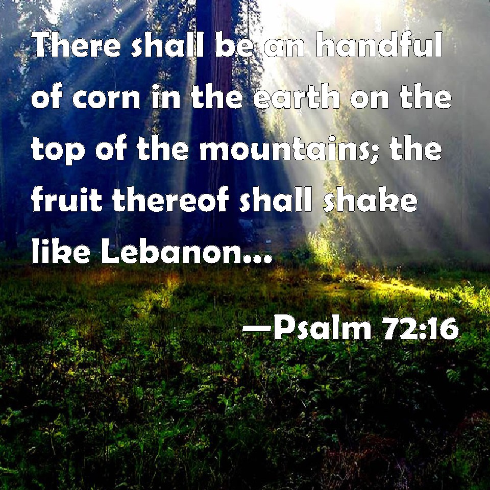 Psalm 72:16 There shall be an handful of corn in the earth on the top of the mountains; the fruit thereof shall shake like Lebanon: and they of the city shall flourish like grass of the earth.