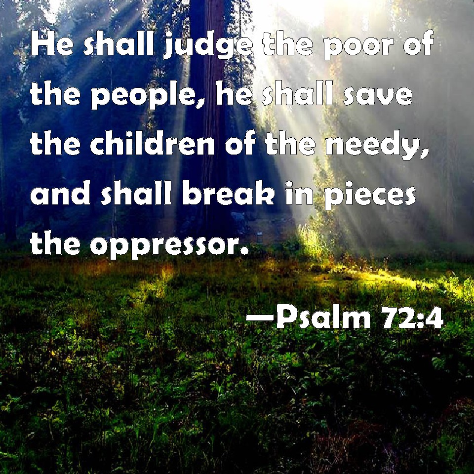 Choose a Background Psalm 72:4 He shall judge the poor of the people, he shall save the children of the needy, and shall break in pieces the oppressor. KJV: He shall judge the poor of the people, he shall save the children of the needy, and shall break in pieces the oppressor. DRB: He shall judge the poor of the people, and he shall save the children of the poor: and he shall humble the oppressor. DBT: He will do justice to the afflicted of the people; he will save the children of the needy, and will break in pieces the oppressor. ERV: He shall judge the poor of the people, he shall save the children of the needy, and shall break in pieces the oppressor. WBT: He shall judge the poor of the people, he shall save the children of the needy, and shall break in pieces the oppressor. WEB: He will judge the poor of the people. He will save the children of the needy, and will break the oppressor in pieces. YLT: He judgeth the poor of the people, Giveth deliverance to the sons of the needy, And bruiseth the oppressor.Links Psalm 72:4 NIV • Psalm 72:4 NLT • Psalm 72:4 ESV • Psalm 72:4 NASB • Psalm 72:4 KJV • Psalm 72:4 Interlinear • Psalm 72:4 Commentaries • Psalm 72:4 Parallel Texts • Psalm 72:4 Bible Apps • Psalm 72:4 Parallel • Bible Hub |