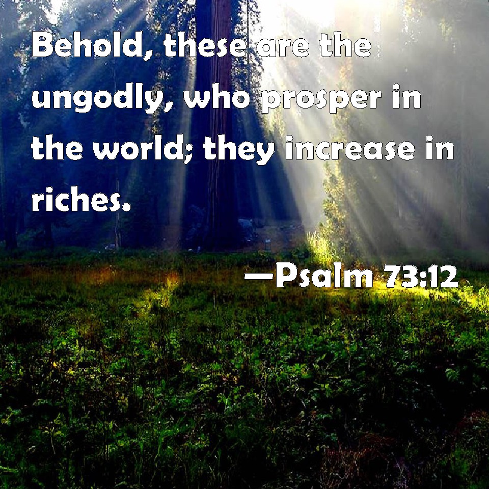 Choose a Background Psalm 73:12 Behold, these are the ungodly, who prosper in the world; they increase in riches. KJV: Behold, these are the ungodly, who prosper in the world; they increase in riches. DRB: Behold these are sinners; and yet abounding in the world they have obtained riches. DBT: Behold, these are the wicked, and they prosper in the world: they heap up riches. ERV: Behold, these are the wicked; and, being alway at ease, they increase in riches. WBT: Behold, these are the ungodly, who prosper in the world; they increase in riches. WEB: Behold, these are the wicked. Being always at ease, they increase in riches. YLT: Lo, these are the wicked and easy ones of the age, They have increased strength.Links Psalm 73:12 NIV • Psalm 73:12 NLT • Psalm 73:12 ESV • Psalm 73:12 NASB • Psalm 73:12 KJV • Psalm 73:12 Interlinear • Psalm 73:12 Commentaries • Psalm 73:12 Parallel Texts • Psalm 73:12 Bible Apps • Psalm 73:12 Parallel • Bible Hub |