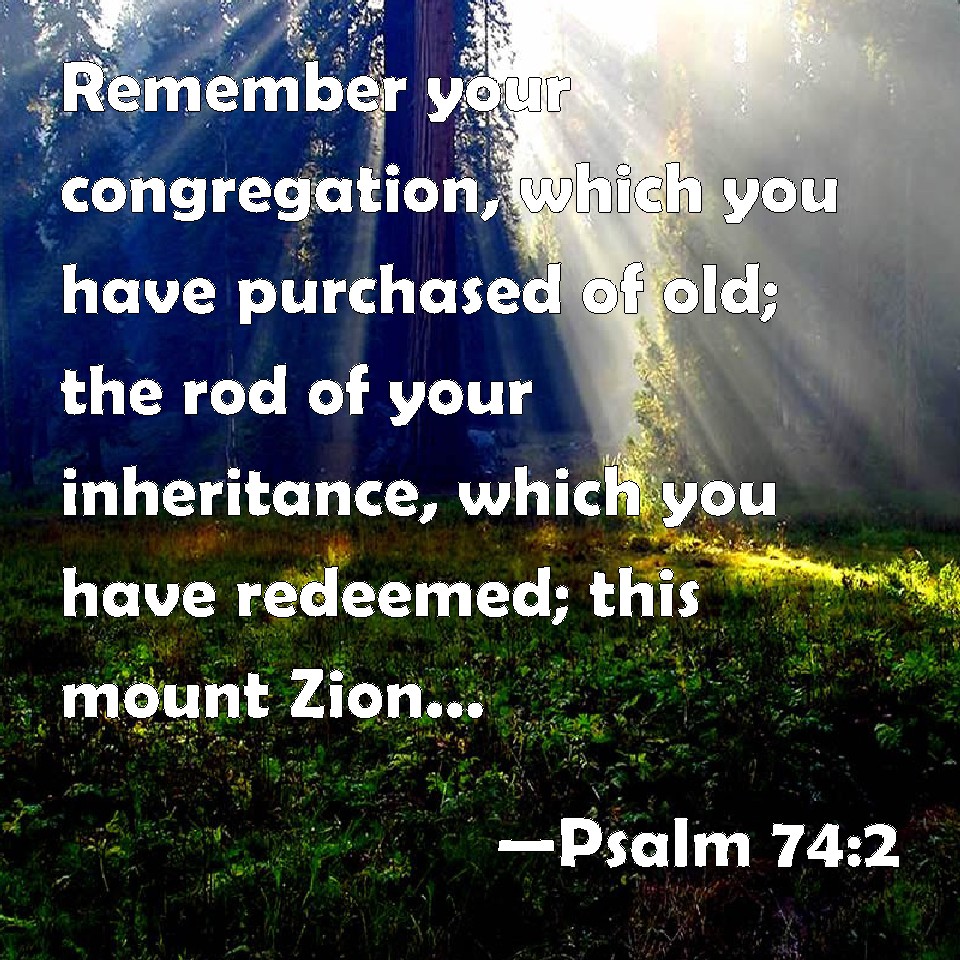 Choose a Background Psalm 74:2 Remember your congregation, which you have purchased of old; the rod of your inheritance, which you have redeemed; this mount Zion, wherein you have dwelled. KJV: Remember thy congregation, which thou hast purchased of old; the rod of thine inheritance, which thou hast redeemed; this mount Zion, wherein thou hast dwelt. DRB: Remember thy congregation, which thou hast possessed from the beginning. The sceptre of thy inheritance which thou hast redeemed: mount Sion in which thou hast dwelt. DBT: Remember thine assembly, which thou hast purchased of old, which thou hast redeemed to be the portion of thine inheritance, this mount Zion, wherein thou hast dwelt. ERV: Remember thy congregation, which thou hast purchased of old, which thou hast redeemed to be the tribe of thine inheritance; and mount Zion, wherein thou hast dwelt. WBT: Remember thy congregation, which thou hast purchased of old: the rod of thy inheritance, which thou hast redeemed; this mount Zion, in which thou hast dwelt. WEB: Remember your congregation, which you purchased of old, which you have redeemed to be the tribe of your inheritance; Mount Zion, in which you have lived. YLT: Remember Thy company. Thou didst purchase of old, Thou didst redeem the rod of Thy inheritance, This mount Zion — Thou didst dwell in it.Links Psalm 74:2 NIV • Psalm 74:2 NLT • Psalm 74:2 ESV • Psalm 74:2 NASB • Psalm 74:2 KJV • Psalm 74:2 Interlinear • Psalm 74:2 Commentaries • Psalm 74:2 Parallel Texts • Psalm 74:2 Bible Apps • Psalm 74:2 Parallel • Bible Hub |
