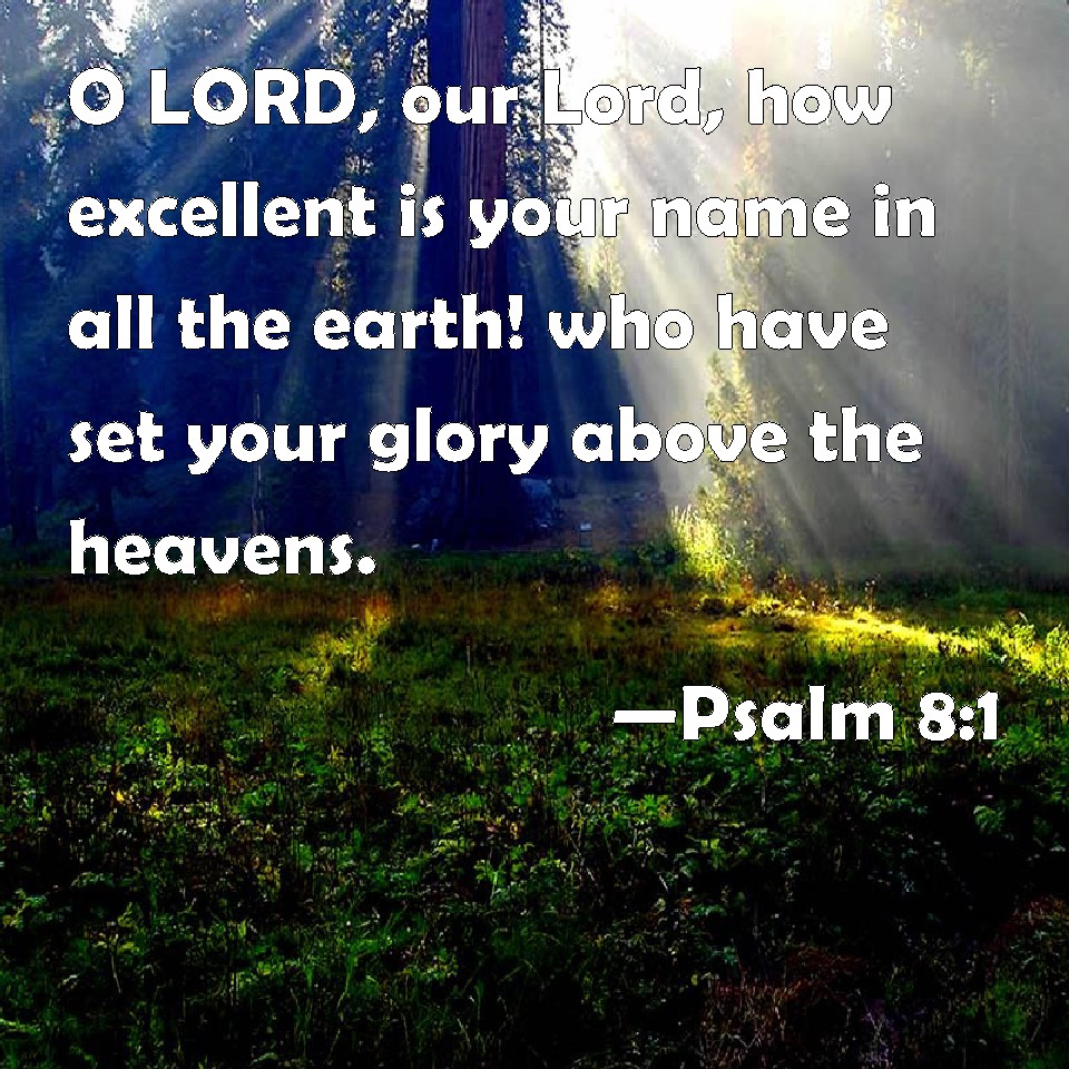 Choose a Background Psalm 8:1 O LORD, our Lord, how excellent is your name in all the earth! who have set your glory above the heavens. KJV: {To the chief Musician upon Gittith, A Psalm of David.} O LORD our Lord, how excellent is thy name in all the earth! who hast set thy glory above the heavens. DRB: Unto the end, for the presses: a psalm of David. O Lord our Lord, how admirable is thy name in the whole earth! For thy magnificence is elevated above the heavens. DBT: {To the chief Musician. Upon the Gittith. A Psalm of David.} Jehovah our Lord, how excellent is thy name in all the earth! who hast set thy majesty above the heavens. ERV: For the Chief Musician; set to the Gittith. A Psalm of David. O LORD, our Lord, how excellent is thy name in all the earth! who hast set thy glory upon the heavens. WBT: To the chief Musician upon Gittith, A Psalm of David. O LORD our Lord, how excellent is thy name in all the earth! who hast set thy glory above the heavens. WEB: Yahweh, our Lord, how majestic is your name in all the earth, who has set your glory above the heavens! YLT: To the Overseer, 'On the Gittith.' A Psalm of David. Jehovah, our Lord, How honourable Thy name in all the earth! Who settest thine honour on the heavens.Links Psalm 8:1 NIV • Psalm 8:1 NLT • Psalm 8:1 ESV • Psalm 8:1 NASB • Psalm 8:1 KJV • Psalm 8:1 Interlinear • Psalm 8:1 Commentaries • Psalm 8:1 Parallel Texts • Psalm 8:1 Bible Apps • Psalm 8:1 Parallel • Bible Hub |