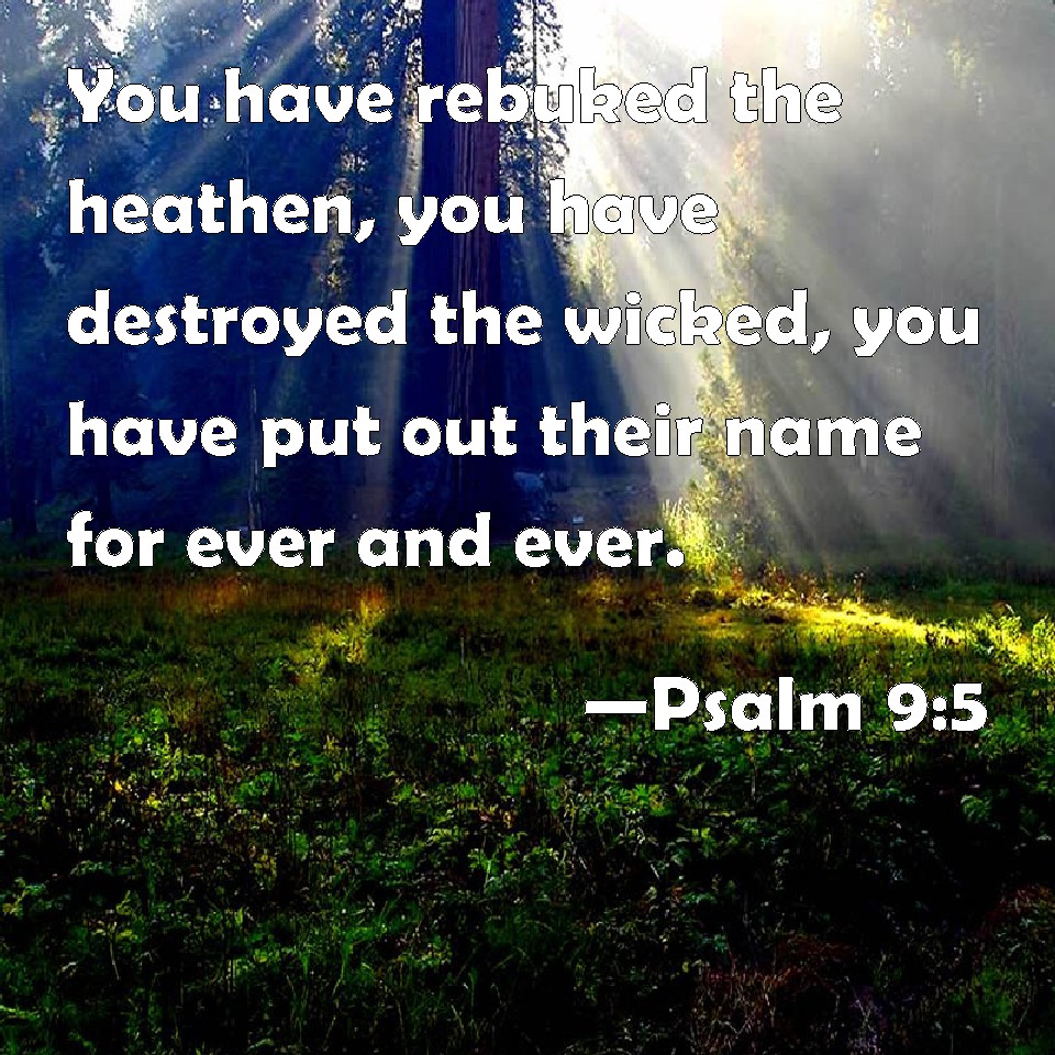 Choose a Background Psalm 9:5 You have rebuked the heathen, you have destroyed the wicked, you have put out their name for ever and ever. KJV: Thou hast rebuked the heathen, thou hast destroyed the wicked, thou hast put out their name for ever and ever. DRB: Thou hast rebuked the Gentiles, and the wicked one hath perished: thou hast blotted out their name for ever and ever. DBT: Thou hast rebuked the nations, thou hast destroyed the wicked; thou hast put out their name for ever and ever. ERV: Thou hast rebuked the nations, thou hast destroyed the wicked, thou hast blotted out their name for ever and ever. WBT: Thou hast rebuked the heathen, thou hast destroyed the wicked, thou hast put out their name for ever and ever. WEB: You have rebuked the nations. You have destroyed the wicked. You have blotted out their name forever and ever. YLT: Thou hast rebuked nations, Thou hast destroyed the wicked, Their name Thou hast blotted out to the age and for ever.Links Psalm 9:5 NIV • Psalm 9:5 NLT • Psalm 9:5 ESV • Psalm 9:5 NASB • Psalm 9:5 KJV • Psalm 9:5 Interlinear • Psalm 9:5 Commentaries • Psalm 9:5 Parallel Texts • Psalm 9:5 Bible Apps • Psalm 9:5 Parallel • Bible Hub |
