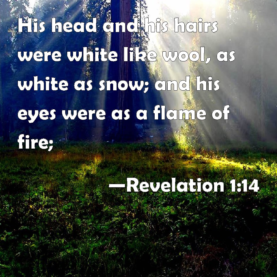 Choose a Background Revelation 1:14 His head and his hairs were white like wool, as white as snow; and his eyes were as a flame of fire; KJV: His head and his hairs were white like wool, as white as snow; and his eyes were as a flame of fire; DRB: And his head and his hairs were white, as white wool, and as snow, and his eyes were as a flame of fire, DBT: his head and hair white like white wool, as snow; and his eyes as a flame of fire; ERV: And his head and his hair were white as white wool, white as snow; and his eyes were as a flame of fire; WBT: His head and his hairs were white like wool, as white as snow; and his eyes were as a flame of fire; WEB: His head and his hair were white as white wool, like snow. His eyes were like a flame of fire. YLT: and his head and hairs white, as if white wool — as snow, and his eyes as a flame of fire;Links Revelation 1:14 NIV • Revelation 1:14 NLT • Revelation 1:14 ESV • Revelation 1:14 NASB • Revelation 1:14 KJV • Revelation 1:14 Interlinear • Revelation 1:14 Commentaries • Revelation 1:14 Parallel Texts • Revelation 1:14 Bible Apps • Revelation 1:14 Parallel • Bible Hub |
