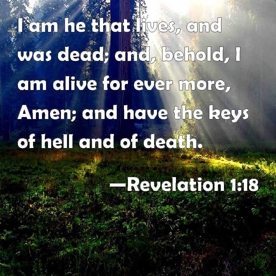 Choose a Background Revelation 1:18 I am he that lives, and was dead; and, behold, I am alive for ever more, Amen; and have the keys of hell and of death. KJV: I am he that liveth, and was dead; and, behold, I am alive for evermore, Amen; and have the keys of hell and of death. DRB: And alive, and was dead, and behold I am living for ever and ever, and have the keys of death and of hell. DBT: and the living one: and I became dead, and behold, I am living to the ages of ages, and have the keys of death and of hades. ERV: and the Living one; and I was dead, and behold, I am alive for evermore, and I have the keys of death and of Hades. WBT: I am he that liveth, and was dead; and behold, I am alive for evermore, Amen; and have the keys of hell and of death. WEB: and the Living one. I was dead, and behold, I am alive forevermore. Amen. I have the keys of Death and of Hades. YLT: and he who is living, and I did become dead, and, lo, I am living to the ages of the ages. Amen! and I have the keys of the hades and of the death.Links Revelation 1:18 NIV • Revelation 1:18 NLT • Revelation 1:18 ESV • Revelation 1:18 NASB • Revelation 1:18 KJV • Revelation 1:18 Interlinear • Revelation 1:18 Commentaries • Revelation 1:18 Parallel Texts • Revelation 1:18 Bible Apps • Revelation 1:18 Parallel • Bible Hub |