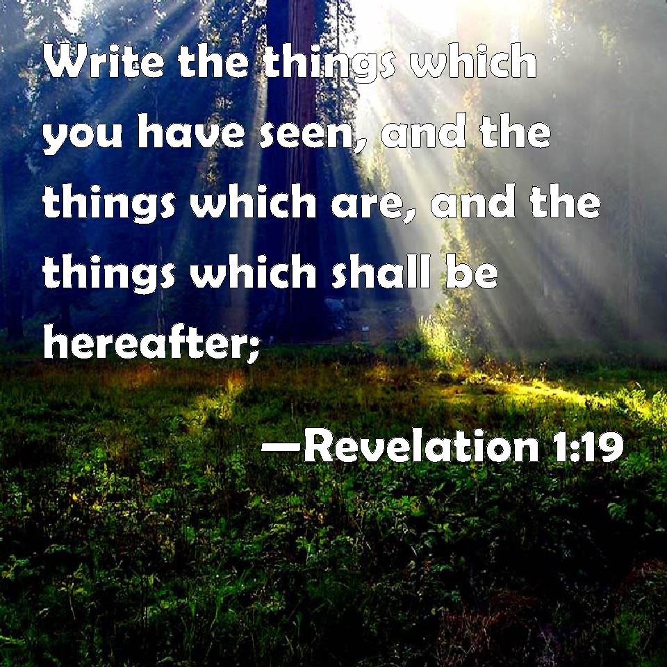 Choose a Background Revelation 1:19 Write the things which you have seen, and the things which are, and the things which shall be hereafter; KJV: Write the things which thou hast seen, and the things which are, and the things which shall be hereafter; DRB: Write therefore the things which thou hast seen, and which are, and which must be done hereafter. DBT: Write therefore what thou hast seen, and the things that are, and the things that are about to be after these. ERV: Write therefore the things which thou sawest, and the things which are, and the things which shall come to pass hereafter; WBT: Write the things which thou hast seen, and the things which are, and the things which shall be hereafter; WEB: Write therefore the things which you have seen, and the things which are, and the things which will happen hereafter; YLT: 'Write the things that thou hast seen, and the things that are, and the things that are about to come after these things;Links Revelation 1:19 NIV • Revelation 1:19 NLT • Revelation 1:19 ESV • Revelation 1:19 NASB • Revelation 1:19 KJV • Revelation 1:19 Interlinear • Revelation 1:19 Commentaries • Revelation 1:19 Parallel Texts • Revelation 1:19 Bible Apps • Revelation 1:19 Parallel • Bible Hub |