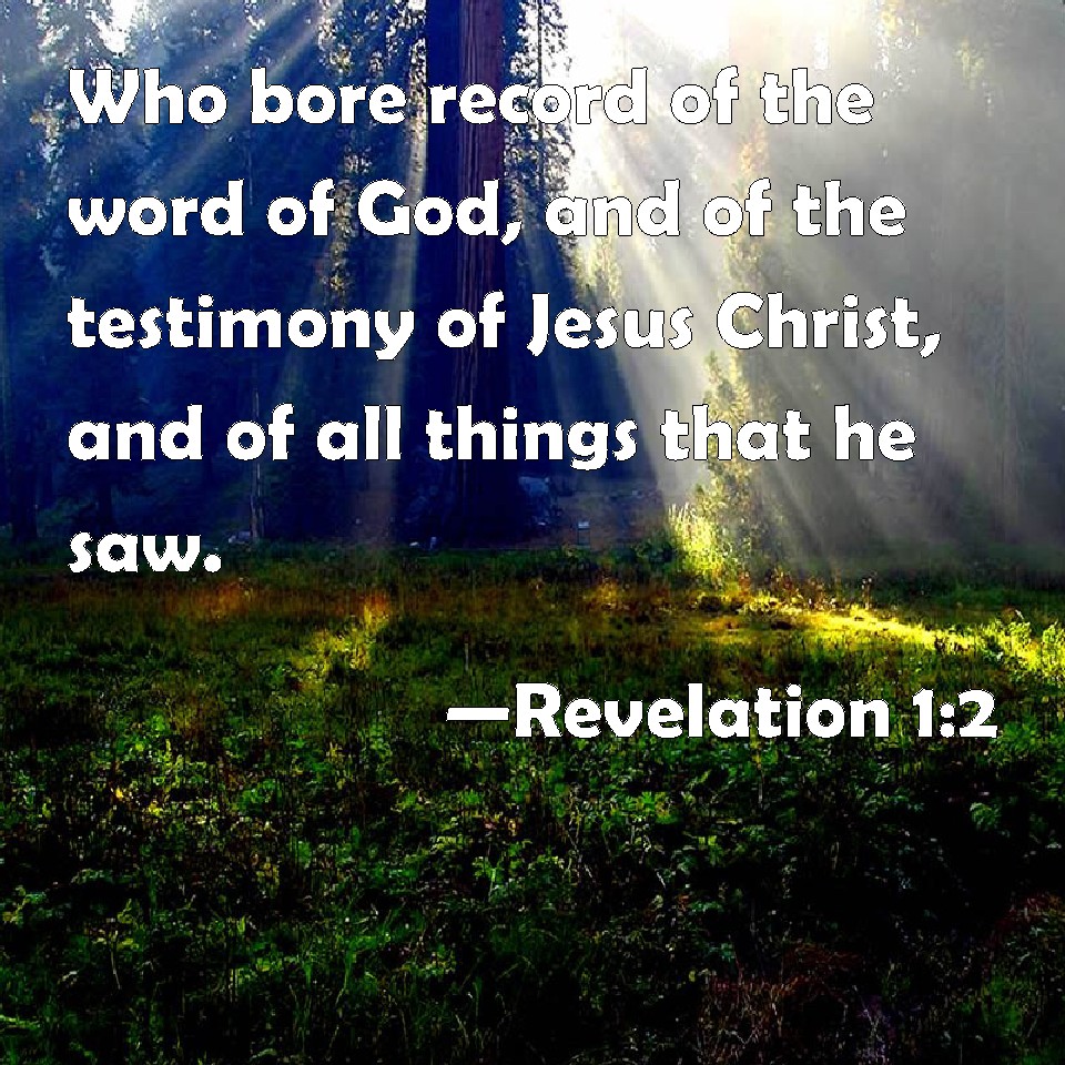 Choose a Background Revelation 1:2 Who bore record of the word of God, and of the testimony of Jesus Christ, and of all things that he saw. KJV: Who bare record of the word of God, and of the testimony of Jesus Christ, and of all things that he saw. DRB: Who hath given testimony to the word of God, and the testimony of Jesus Christ, what things soever he hath seen. DBT: who testified the word of God, and the testimony of Jesus Christ, all things that he saw. ERV: who bare witness of the word of God, and of the testimony of Jesus Christ, even of all things that he saw. WBT: Who bore testimony of the word of God, and of the testimony of Jesus Christ, and of all things that he saw. WEB: who testified to God's word, and of the testimony of Jesus Christ, about everything that he saw. YLT: who did testify the word of God, and the testimony of Jesus Christ, as many things also as he did see.Links Revelation 1:2 NIV • Revelation 1:2 NLT • Revelation 1:2 ESV • Revelation 1:2 NASB • Revelation 1:2 KJV • Revelation 1:2 Interlinear • Revelation 1:2 Commentaries • Revelation 1:2 Parallel Texts • Revelation 1:2 Bible Apps • Revelation 1:2 Parallel • Bible Hub |