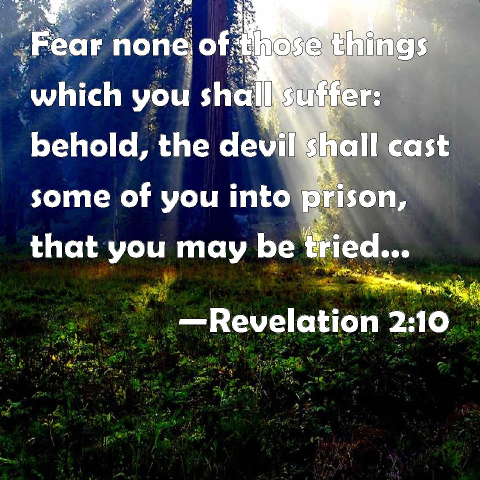 Choose a Background Revelation 2:10 Fear none of those things which you shall suffer: behold, the devil shall cast some of you into prison, that you may be tried; and you shall have tribulation ten days: be you faithful to death, and I will give you a crown of life. KJV: Fear none of those things which thou shalt suffer: behold, the devil shall cast some of you into prison, that ye may be tried; and ye shall have tribulation ten days: be thou faithful unto death, and I will give thee a crown of life. DRB: Fear none of those things which thou shalt suffer. Behold, the devil will cast some of you into prison that you may be tried: and you shall have tribulation ten days. Be thou faithful until death: and I will give thee the crown of life. DBT: Fear nothing of what thou art about to suffer. Behold, the devil is about to cast of you into prison, that ye may be tried; and ye shall have tribulation ten days. Be thou faithful unto death, and I will give to thee the crown of life. ERV: Fear not the things which thou art about to suffer: behold, the devil is about to cast some of you into prison, that ye may be tried; and ye shall have tribulation ten days. Be thou faithful unto death, and I will give thee the crown of life. WBT: Fear none of those things which thou shalt suffer. Behold, the devil will cast some of you into prison, that ye may be tried; and ye shall have tribulation ten days. Be thou faithful to death, and I will give thee a crown of life. WEB: Don't be afraid of the things which you are about to suffer. Behold, the devil is about to throw some of you into prison, that you may be tested; and you will have oppression for ten days. Be faithful to death, and I will give you the crown of life. YLT: 'Be not afraid of the things that thou art about to suffer; lo, the devil is about to cast of you to prison, that ye may be tried, and ye shall have tribulation ten days; become thou faithful unto death, and I will give to thee the crown of the life.Links Revelation 2:10 NIV • Revelation 2:10 NLT • Revelation 2:10 ESV • Revelation 2:10 NASB • Revelation 2:10 KJV • Revelation 2:10 Interlinear • Revelation 2:10 Commentaries • Revelation 2:10 Parallel Texts • Revelation 2:10 Bible Apps • Revelation 2:10 Parallel • Bible Hub |