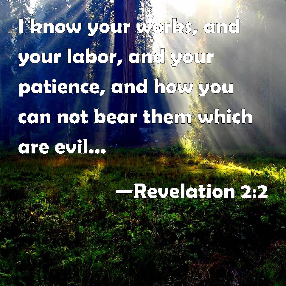 Choose a Background Revelation 2:2 I know your works, and your labor, and your patience, and how you can not bear them which are evil: and you have tried them which say they are apostles, and are not, and have found them liars: KJV: I know thy works, and thy labour, and thy patience, and how thou canst not bear them which are evil: and thou hast tried them which say they are apostles, and are not, and hast found them liars: DRB: I know thy works, and thy labour, and thy patience, and how thou canst not bear them that are evil, and thou hast tried them, who say they are apostles, and are not, and hast found them liars: DBT: I know thy works and thy labour, and thine endurance, and that thou canst not bear evil men; and thou hast tried them who say that themselves are apostles and are not, and hast found them liars; ERV: I know thy works, and thy toil and patience, and that thou canst not bear evil men, and didst try them which call themselves apostles, and they are not, and didst find them false; WBT: I know thy works, and thy labor, and thy patience, and that thou canst not bear them who are evil; and thou hast tried them who say they are apostles, and are not; and hast found them liars: WEB: "I know your works, and your toil and perseverance, and that you can't tolerate evil men, and have tested those who call themselves apostles, and they are not, and found them false. YLT: I have known thy works, and thy labour, and thy endurance, and that thou art not able to bear evil ones, and that thou hast tried those saying themselves to be apostles and are not, and hast found them liars,Links Revelation 2:2 NIV • Revelation 2:2 NLT • Revelation 2:2 ESV • Revelation 2:2 NASB • Revelation 2:2 KJV • Revelation 2:2 Interlinear • Revelation 2:2 Commentaries • Revelation 2:2 Parallel Texts • Revelation 2:2 Bible Apps • Revelation 2:2 Parallel • Bible Hub |