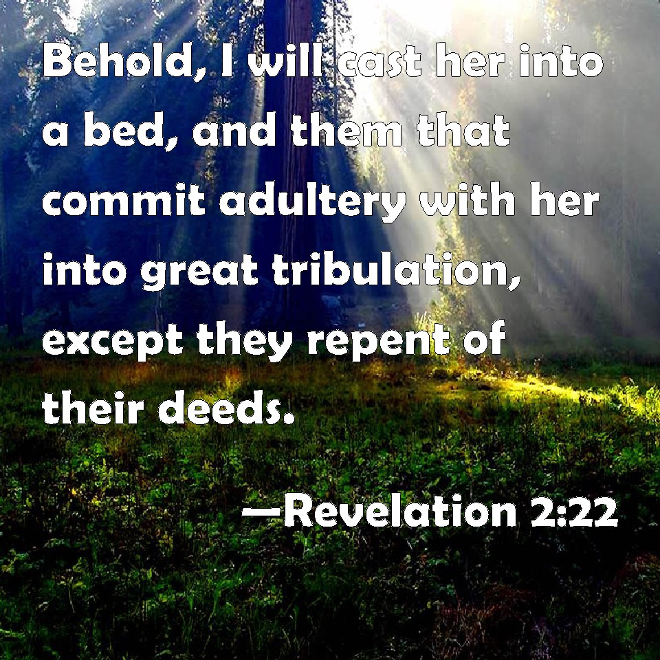 Choose a Background Revelation 2:22 Behold, I will cast her into a bed, and them that commit adultery with her into great tribulation, except they repent of their deeds. KJV: Behold, I will cast her into a bed, and them that commit adultery with her into great tribulation, except they repent of their deeds. DRB: Behold, I will cast her into a bed: and they that commit adultery with her shall be in very great tribulation, except they do penance from their deeds. DBT: Behold, I cast her into a bed, and those that commit adultery with her into great tribulation, unless they repent of her works, ERV: Behold, I do cast her into a bed, and them that commit adultery with her into great tribulation, except they repent of her works. WBT: Behold, I will cast her into a bed, and them that commit adultery with her into great tribulation, except they repent of their deeds. WEB: Behold, I will throw her into a bed, and those who commit adultery with her into great oppression, unless they repent of her works. YLT: lo, I will cast her into a couch, and those committing adultery with her into great tribulation — if they may not repent of their works,Links Revelation 2:22 NIV • Revelation 2:22 NLT • Revelation 2:22 ESV • Revelation 2:22 NASB • Revelation 2:22 KJV • Revelation 2:22 Interlinear • Revelation 2:22 Commentaries • Revelation 2:22 Parallel Texts • Revelation 2:22 Bible Apps • Revelation 2:22 Parallel • Bible Hub |