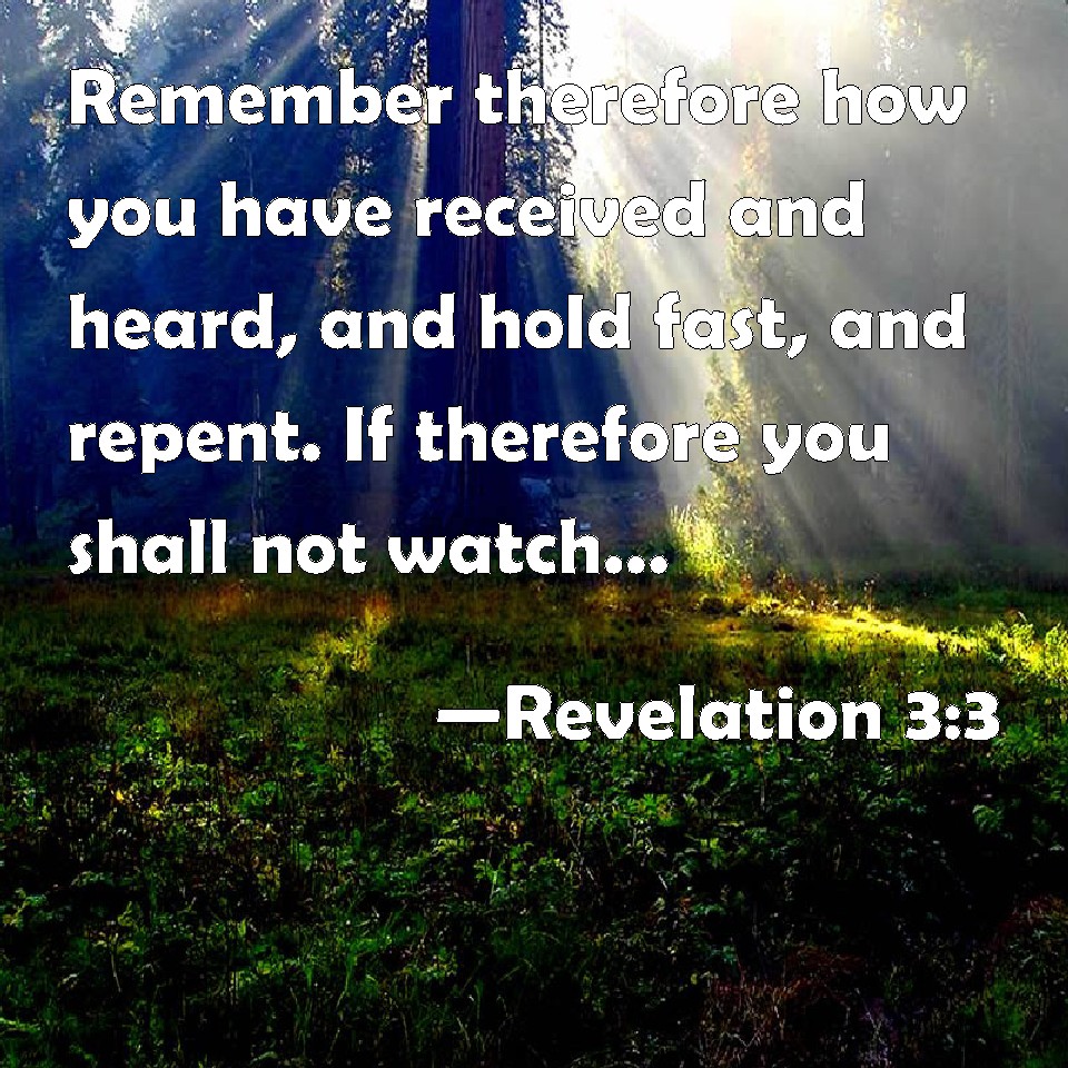 Choose a Background Revelation 3:3 Remember therefore how you have received and heard, and hold fast, and repent. If therefore you shall not watch, I will come on you as a thief, and you shall not know what hour I will come on you. KJV: Remember therefore how thou hast received and heard, and hold fast, and repent. If therefore thou shalt not watch, I will come on thee as a thief, and thou shalt not know what hour I will come upon thee. DRB: Have in mind therefore in what manner thou hast received and heard: and observe, and do penance. If then thou shalt not watch, I will come to thee as a thief, and thou shalt not know at what hour I will come to thee. DBT: Remember therefore how thou hast received and heard, and keep it and repent. If therefore thou shalt not watch, I will come upon thee as a thief, and thou shalt not know at what hour I shall come upon thee. ERV: Remember therefore how thou hast received and didst hear; and keep it, and repent. If therefore thou shalt not watch, I will come as a thief, and thou shalt not know what hour I will come upon thee. WBT: Remember therefore how thou hast received and heard, and hold fast, and repent. If therefore thou shalt not watch, I will come on thee as a thief, and thou shalt not know what hour I will come upon thee. WEB: Remember therefore how you have received and heard. Keep it, and repent. If therefore you won't watch, I will come as a thief, and you won't know what hour I will come upon you. YLT: 'Remember, then, how thou hast received, and heard, and be keeping, and reform: if, then, thou mayest not watch, I will come upon thee as a thief, and thou mayest not know what hour I will come upon thee.Links Revelation 3:3 NIV • Revelation 3:3 NLT • Revelation 3:3 ESV • Revelation 3:3 NASB • Revelation 3:3 KJV • Revelation 3:3 Interlinear • Revelation 3:3 Commentaries • Revelation 3:3 Parallel Texts • Revelation 3:3 Bible Apps • Revelation 3:3 Parallel • Bible Hub |