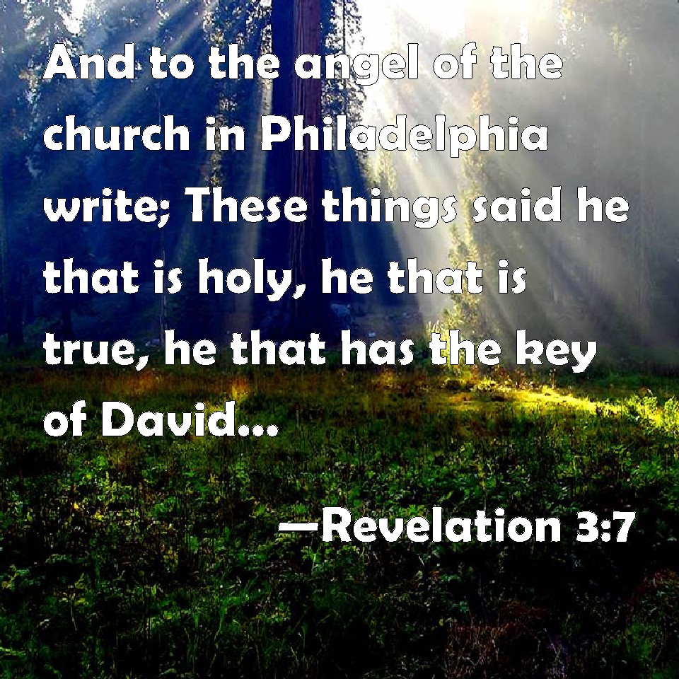 Choose a Background Revelation 3:7 And to the angel of the church in Philadelphia write; These things said he that is holy, he that is true, he that has the key of David, he that opens, and no man shuts; and shuts, and no man opens; KJV: And to the angel of the church in Philadelphia write; These things saith he that is holy, he that is true, he that hath the key of David, he that openeth, and no man shutteth; and shutteth, and no man openeth; DRB: And to the angel of the church of Philadelphia, write: These things saith the Holy One and the true one, he that hath the key of David; he that openeth, and no man shutteth; shutteth, and no man openeth: DBT: And to the angel of the assembly in Philadelphia write: These things saith the holy, the true; he that has the key of David, he who opens and no one shall shut, and shuts and no one shall open: ERV: And to the angel of the church in Philadelphia write; These things saith he that is holy, he that is true, he that hath the key of David, he that openeth, and none shall shut, and that shutteth, and none openeth: WBT: And to the angel of the church in Philadelphia write; These things saith he that is holy, he that is true, he that hath the key of David, he that openeth, and no man shutteth; and shutteth, and no man openeth: WEB: "To the angel of the assembly in Philadelphia write: "He who is holy, he who is true, he who has the key of David, he who opens and no one can shut, and who shuts and no one opens, says these things: YLT: 'And to the messenger of the assembly in Philadelphia write: These things saith he who is holy, he who is true, he who is having the key of David, he who is opening and no one doth shut, and he shutteth and no one doth open!Links Revelation 3:7 NIV • Revelation 3:7 NLT • Revelation 3:7 ESV • Revelation 3:7 NASB • Revelation 3:7 KJV • Revelation 3:7 Interlinear • Revelation 3:7 Commentaries • Revelation 3:7 Parallel Texts • Revelation 3:7 Bible Apps • Revelation 3:7 Parallel • Bible Hub |