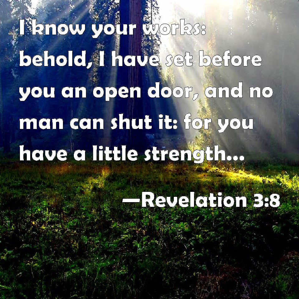 Choose a Background Revelation 3:8 I know your works: behold, I have set before you an open door, and no man can shut it: for you have a little strength, and have kept my word, and have not denied my name. KJV: I know thy works: behold, I have set before thee an open door, and no man can shut it: for thou hast a little strength, and hast kept my word, and hast not denied my name. DRB: I know thy works. Behold, I have given before thee a door opened, which no man can shut: because thou hast a little strength, and hast kept my word, and hast not denied my name. DBT: I know thy works: behold, I have set before thee an opened door, which no one can shut, because thou hast a little power, and hast kept my word, and hast not denied my name. ERV: I know thy works (behold, I have set before thee a door opened, which none can shut), that thou hast a little power, and didst keep my word, and didst not deny my name. WBT: I know thy works: behold, I have set before thee an open door, and no man can shut it: for thou hast a little strength, and hast kept my word, and hast not denied my name. WEB: "I know your works (behold, I have set before you an open door, which no one can shut), that you have a little power, and kept my word, and didn't deny my name. YLT: I have known thy works; lo, I have set before thee a door — opened, and no one is able to shut it, because thou hast a little power, and didst keep my word, and didst not deny my name;Links Revelation 3:8 NIV • Revelation 3:8 NLT • Revelation 3:8 ESV • Revelation 3:8 NASB • Revelation 3:8 KJV • Revelation 3:8 Interlinear • Revelation 3:8 Commentaries • Revelation 3:8 Parallel Texts • Revelation 3:8 Bible Apps • Revelation 3:8 Parallel • Bible Hub |