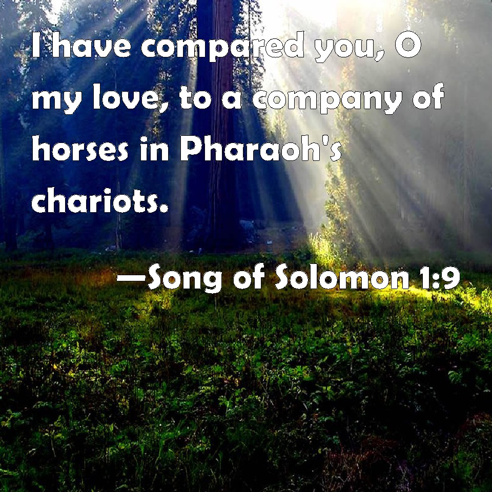 Choose a Background Song of Solomon 1:9 I have compared you, O my love, to a company of horses in Pharaoh's chariots. KJV: I have compared thee, O my love, to a company of horses in Pharaoh's chariots. DRB: To my company of horsemen, in Pharao's chariots, have I likened thee, O my love. DBT: I compare thee, my love, To a steed in Pharaoh's chariots. ERV: I have compared thee, O my love, to a steed in Pharaoh's chariots. WBT: I have compared thee, O my love, to a company of horses in Pharaoh's chariots. WEB: I have compared you, my love, to a steed in Pharaoh's chariots. YLT: To my joyous one in chariots of Pharaoh, I have compared thee, my friend,Links Song of Solomon 1:9 NIV • Song of Solomon 1:9 NLT • Song of Solomon 1:9 ESV • Song of Solomon 1:9 NASB • Song of Solomon 1:9 KJV • Song of Solomon 1:9 Interlinear • Song of Solomon 1:9 Commentaries • Song of Solomon 1:9 Parallel Texts • Song of Solomon 1:9 Bible Apps • Song of Solomon 1:9 Parallel • Bible Hub |