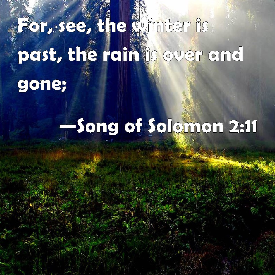 Choose a Background Song of Solomon 2:11 For, see, the winter is past, the rain is over and gone; KJV: For, lo, the winter is past, the rain is over and gone; DRB: For winter is now past, the rain is over and gone. DBT: For behold, the winter is past, The rain is over, it is gone: ERV: For, lo, the winter is past, the rain is over and gone; WBT: For lo, the winter is past, the rain is over and gone. WEB: For, behold, the winter is past. The rain is over and gone. YLT: For lo, the winter hath passed by, The rain hath passed away — it hath gone.Links Song of Solomon 2:11 NIV • Song of Solomon 2:11 NLT • Song of Solomon 2:11 ESV • Song of Solomon 2:11 NASB • Song of Solomon 2:11 KJV • Song of Solomon 2:11 Interlinear • Song of Solomon 2:11 Commentaries • Song of Solomon 2:11 Parallel Texts • Song of Solomon 2:11 Bible Apps • Song of Solomon 2:11 Parallel • Bible Hub |