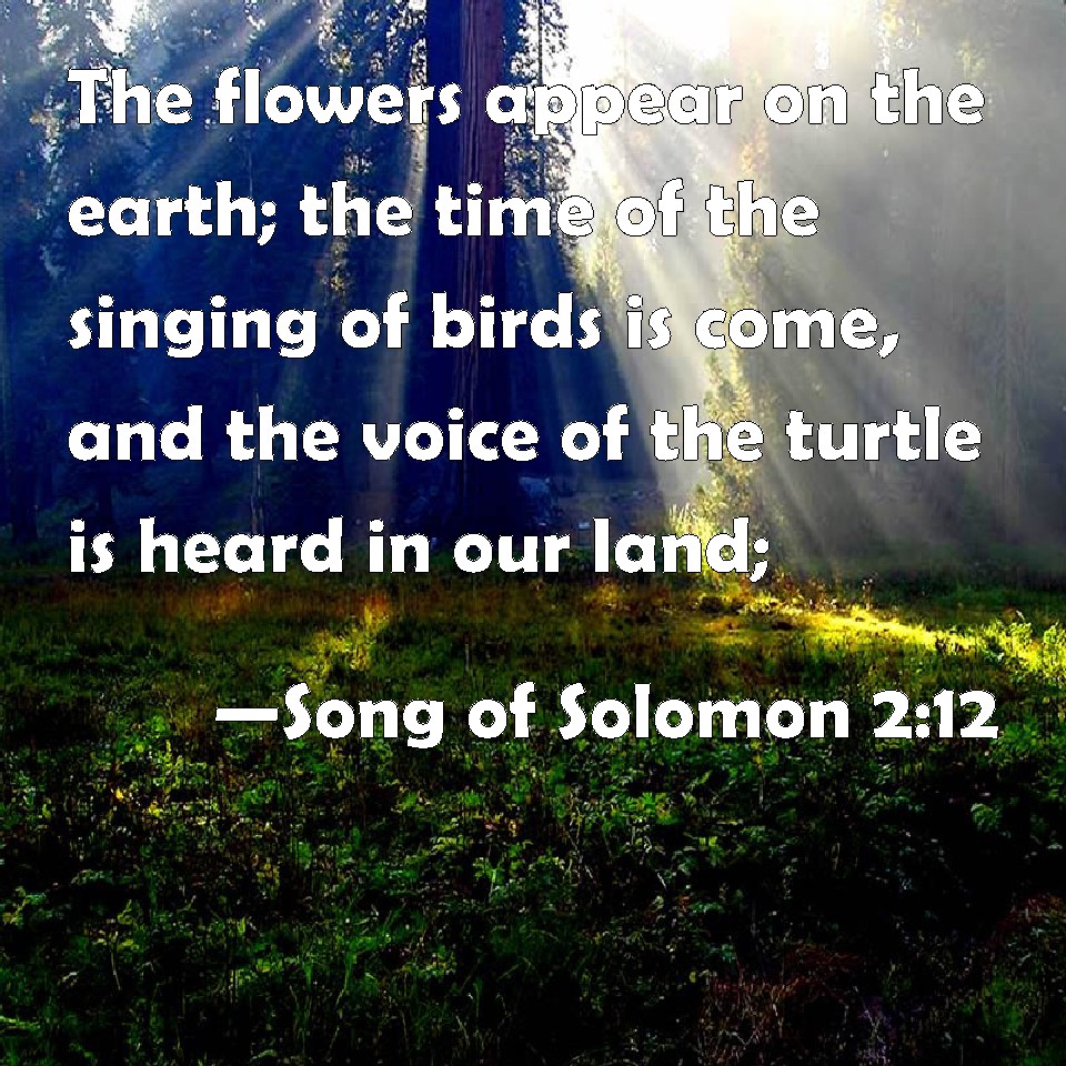 Choose a Background Song of Solomon 2:12 The flowers appear on the earth; the time of the singing of birds is come, and the voice of the turtle is heard in our land; KJV: The flowers appear on the earth; the time of the singing of birds is come, and the voice of the turtle is heard in our land; DRB: The flowers have appeared in our land, the time of pruning is come: the voice of the turtle is heard in our land: DBT: The flowers appear on the earth; The time of singing is come, And the voice of the turtle-dove is heard in our land; ERV: The flowers appear on the earth; the time of the singing of birds is come, and the voice of the turtle is heard in our land; WBT: The flowers appear on the earth; the time of the singing of birds is come, and the voice of the turtle is heard in our land; WEB: The flowers appear on the earth. The time of the singing has come, and the voice of the turtledove is heard in our land. YLT: The flowers have appeared in the earth, The time of the singing hath come, And the voice of the turtle was heard in our land,Links Song of Solomon 2:12 NIV • Song of Solomon 2:12 NLT • Song of Solomon 2:12 ESV • Song of Solomon 2:12 NASB • Song of Solomon 2:12 KJV • Song of Solomon 2:12 Interlinear • Song of Solomon 2:12 Commentaries • Song of Solomon 2:12 Parallel Texts • Song of Solomon 2:12 Bible Apps • Song of Solomon 2:12 Parallel • Bible Hub |