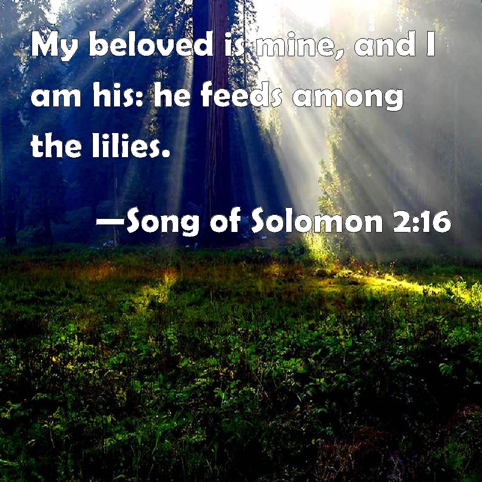 Choose a Background Song of Solomon 2:16 My beloved is mine, and I am his: he feeds among the lilies. KJV: My beloved is mine, and I am his: he feedeth among the lilies. DRB: My beloved to me, and I to him who feedeth among the lilies, DBT: My beloved is mine, and I am his; He feedeth his flock among the lilies, ERV: My beloved is mine, and I am his: he feedeth his flock among the lilies. WBT: My beloved is mine, and I am his: he feedeth among the lilies. WEB: My beloved is mine, and I am his. He browses among the lilies. YLT: My beloved is mine, and I am his, Who is delighting among the lilies,Links Song of Solomon 2:16 NIV • Song of Solomon 2:16 NLT • Song of Solomon 2:16 ESV • Song of Solomon 2:16 NASB • Song of Solomon 2:16 KJV • Song of Solomon 2:16 Interlinear • Song of Solomon 2:16 Commentaries • Song of Solomon 2:16 Parallel Texts • Song of Solomon 2:16 Bible Apps • Song of Solomon 2:16 Parallel • Bible Hub |