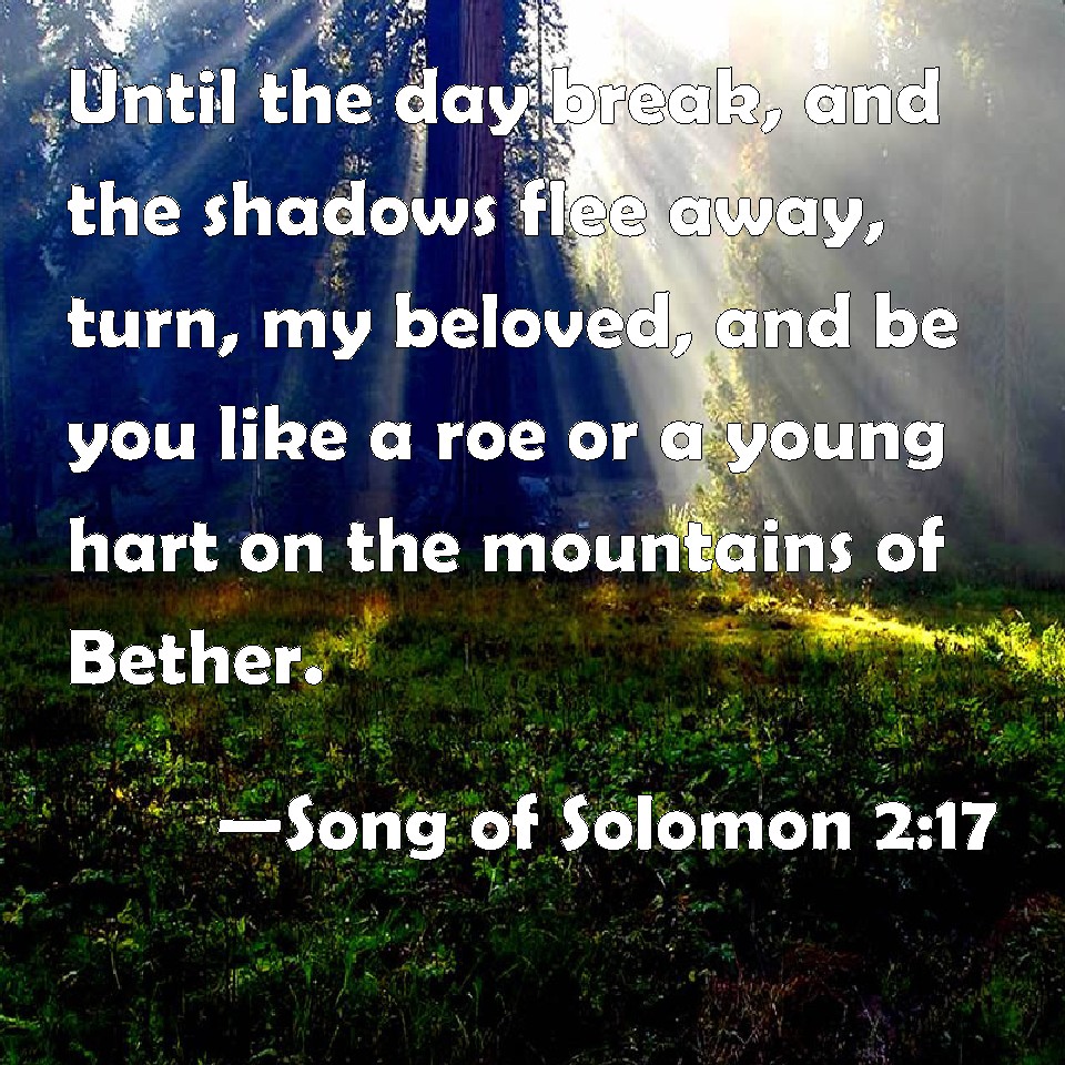 Choose a Background Song of Solomon 2:17 Until the day break, and the shadows flee away, turn, my beloved, and be you like a roe or a young hart on the mountains of Bether. KJV: Until the day break, and the shadows flee away, turn, my beloved, and be thou like a roe or a young hart upon the mountains of Bether. DRB: Till the day break, and the shadows retire. Return: be like, my beloved, to a roe, or to a young hart upon the mountains of Bether. DBT: Until the day dawn, and the shadows flee away. Turn, my beloved: be thou like a gazelle or a young hart, Upon the mountains of Bether. ERV: Until the day be cool, and the shadows flee away, turn, my beloved, and be thou like a roe or a young hart upon the mountains of Bether. WBT: Until the day shall break, and the shadows flee away, turn, my beloved, and be thou like a roe or a young hart upon the mountains of Bether. WEB: Until the day is cool, and the shadows flee away, turn, my beloved, and be like a roe or a young hart on the mountains of Bether. YLT: Till the day doth break forth, And the shadows have fled away, Turn, be like, my beloved, To a roe, or to a young one of the harts, On the mountains of separation!Links Song of Solomon 2:17 NIV • Song of Solomon 2:17 NLT • Song of Solomon 2:17 ESV • Song of Solomon 2:17 NASB • Song of Solomon 2:17 KJV • Song of Solomon 2:17 Interlinear • Song of Solomon 2:17 Commentaries • Song of Solomon 2:17 Parallel Texts • Song of Solomon 2:17 Bible Apps • Song of Solomon 2:17 Parallel • Bible Hub |