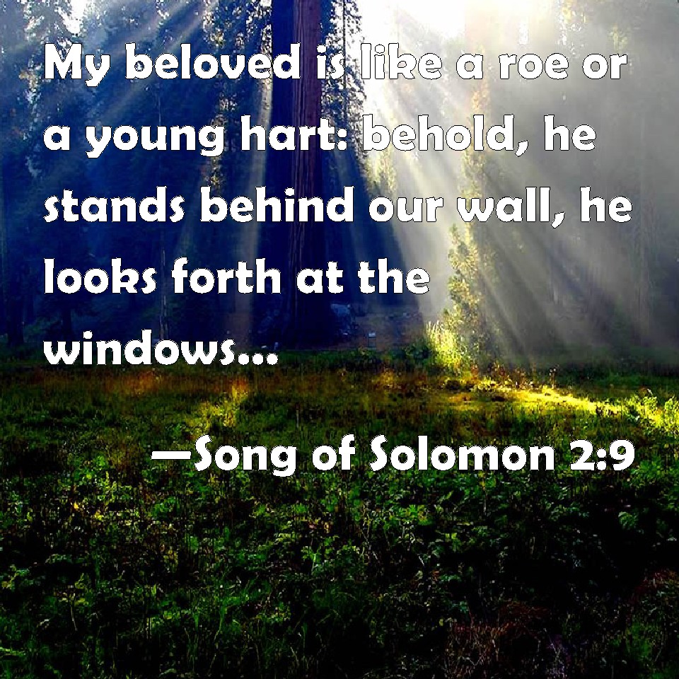 Choose a Background Song of Solomon 2:9 My beloved is like a roe or a young hart: behold, he stands behind our wall, he looks forth at the windows, showing himself through the lattice. KJV: My beloved is like a roe or a young hart: behold, he standeth behind our wall, he looketh forth at the windows, shewing himself through the lattice. DRB: My beloved is like a roe, or a young hart. Behold he standeth behind our wall, looking through the windows, looking through the lattices. DBT: My beloved is like a gazelle or a young hart. Behold, he standeth behind our wall, He looketh in through the windows, Glancing through the lattice. ERV: My beloved is like a roe or a young hart: behold, he standeth behind our wall, he looketh in at the windows, he sheweth himself through the lattice. WBT: My beloved is like a roe, or a young hart: behold, he standeth behind our wall, he looketh forth at the windows, showing himself through the lattice. WEB: My beloved is like a roe or a young hart. Behold, he stands behind our wall! He looks in at the windows. He glances through the lattice. YLT: My beloved is like to a roe, Or to a young one of the harts. Lo, this — he is standing behind our wall, Looking from the windows, Blooming from the lattice.Links Song of Solomon 2:9 NIV • Song of Solomon 2:9 NLT • Song of Solomon 2:9 ESV • Song of Solomon 2:9 NASB • Song of Solomon 2:9 KJV • Song of Solomon 2:9 Interlinear • Song of Solomon 2:9 Commentaries • Song of Solomon 2:9 Parallel Texts • Song of Solomon 2:9 Bible Apps • Song of Solomon 2:9 Parallel • Bible Hub |