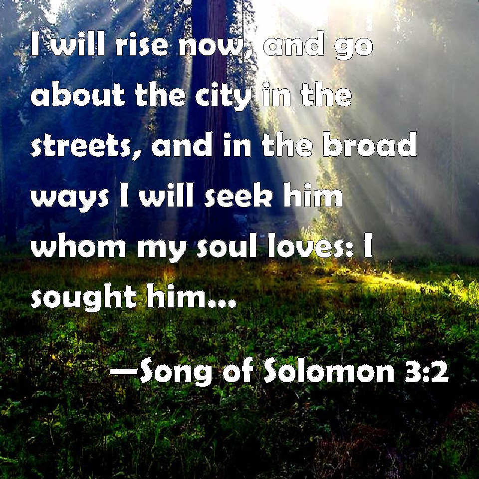 Choose a Background Song of Solomon 3:2 I will rise now, and go about the city in the streets, and in the broad ways I will seek him whom my soul loves: I sought him, but I found him not. KJV: I will rise now, and go about the city in the streets, and in the broad ways I will seek him whom my soul loveth: I sought him, but I found him not. DRB: I will rise, and will go about the city: in the streets and the broad ways I will seek him whom my soul loveth: I sought him, and I found him not. DBT: I will rise now, and go about the city; In the streets and in the broadways Will I seek him whom my soul loveth: I sought him, but I found him not. ERV: I said, I will rise now, and go about the city, in the streets and in the broad ways, I will seek him whom my soul loveth: I sought him, but I found him not. WBT: I will rise now, and go about the city in the streets, and in the broad ways I will seek him whom my soul loveth: I sought him, but I found him not. WEB: I will get up now, and go about the city; in the streets and in the squares I will seek him whom my soul loves. I sought him, but I didn't find him. YLT: — Pray, let me rise, and go round the city, In the streets and in the broad places, I seek him whom my soul hath loved! — I sought him, and I found him not.Links Song of Solomon 3:2 NIV • Song of Solomon 3:2 NLT • Song of Solomon 3:2 ESV • Song of Solomon 3:2 NASB • Song of Solomon 3:2 KJV • Song of Solomon 3:2 Interlinear • Song of Solomon 3:2 Commentaries • Song of Solomon 3:2 Parallel Texts • Song of Solomon 3:2 Bible Apps • Song of Solomon 3:2 Parallel • Bible Hub |