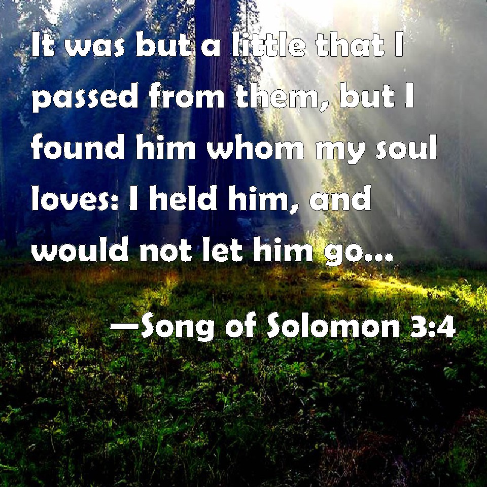 Choose a Background Song of Solomon 3:4 It was but a little that I passed from them, but I found him whom my soul loves: I held him, and would not let him go, until I had brought him into my mother's house, and into the chamber of her that conceived me. KJV: It was but a little that I passed from them, but I found him whom my soul loveth: I held him, and would not let him go, until I had brought him into my mother's house, and into the chamber of her that conceived me. DRB: When I had a little passed by them, I found him whom my soul loveth: I held him: and I will not let him go, till I bring him into my mother's house, and into the chamber of her that bore me. DBT: Scarcely had I passed from them, When I found him whom my soul loveth: I held him, and would not let him go, Until I had brought him into my mother's house, And into the chamber of her that conceived me. ERV: It was but a little that I passed from them, when I found him whom my soul loveth: I held him, and would not let him go, until I had brought him into my mother's house, and into the chamber of her that conceived me. WBT: It was but a little that I passed from them, but I found him whom my soul loveth: I held him, and would not let him go, until I had brought him into my mother's house, and into the chamber of her that conceived me. WEB: I had scarcely passed from them, when I found him whom my soul loves. I held him, and would not let him go, until I had brought him into my mother's house, into the room of her who conceived me. YLT: But a little I passed on from them, Till I found him whom my soul hath loved! I seized him, and let him not go, Till I brought him in unto the house of my mother — And the chamber of her that conceived me.Links Song of Solomon 3:4 NIV • Song of Solomon 3:4 NLT • Song of Solomon 3:4 ESV • Song of Solomon 3:4 NASB • Song of Solomon 3:4 KJV • Song of Solomon 3:4 Interlinear • Song of Solomon 3:4 Commentaries • Song of Solomon 3:4 Parallel Texts • Song of Solomon 3:4 Bible Apps • Song of Solomon 3:4 Parallel • Bible Hub |