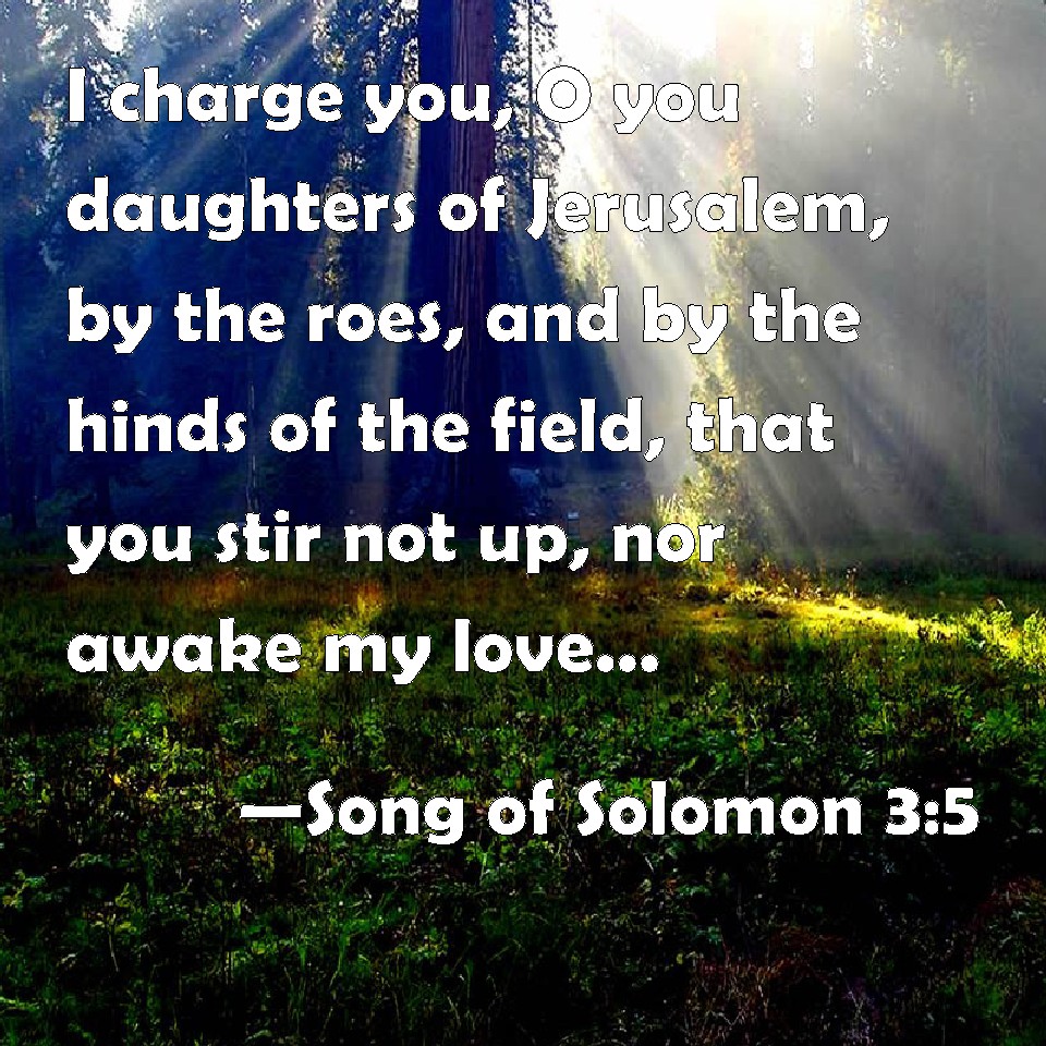 Choose a Background Song of Solomon 3:5 I charge you, O you daughters of Jerusalem, by the roes, and by the hinds of the field, that you stir not up, nor awake my love, till he please. KJV: I charge you, O ye daughters of Jerusalem, by the roes, and by the hinds of the field, that ye stir not up, nor awake my love, till he please. DRB: I adjure you, O daughters of Jerusalem, by the roes and the harts of the fields, that you stir not up, nor awake my beloved, till she please. DBT: I charge you, daughters of Jerusalem, By the gazelles, or by the hinds of the field, That ye stir not up, nor awake my love, till he please. ERV: I adjure you, O daughters of Jerusalem, by the roes, and by the hinds of the field, that ye stir not up, nor awaken love, until it please. WBT: I charge you, O ye daughters of Jerusalem, by the roes, and by the hinds of the field, that ye stir not up, nor awake my love, till he please. WEB: I adjure you, daughters of Jerusalem, by the roes, or by the hinds of the field, that you not stir up, nor awaken love, until it so desires. YLT: I have adjured you, daughters of Jerusalem, By the roes or by the hinds of the field, Stir not up nor wake the love till she please!Links Song of Solomon 3:5 NIV • Song of Solomon 3:5 NLT • Song of Solomon 3:5 ESV • Song of Solomon 3:5 NASB • Song of Solomon 3:5 KJV • Song of Solomon 3:5 Interlinear • Song of Solomon 3:5 Commentaries • Song of Solomon 3:5 Parallel Texts • Song of Solomon 3:5 Bible Apps • Song of Solomon 3:5 Parallel • Bible Hub |