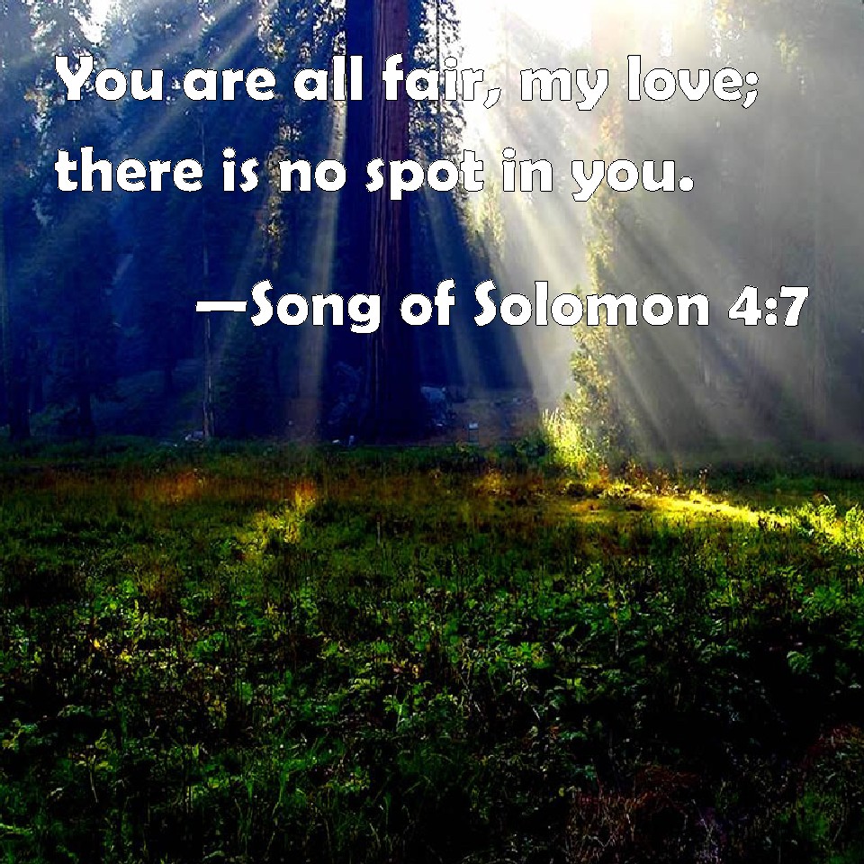 Choose a Background Song of Solomon 4:7 You are all fair, my love; there is no spot in you. KJV: Thou art all fair, my love; there is no spot in thee. DRB: Thou art all fair, O my love, and there is not a spot in thee. DBT: Thou art all fair, my love; And there is no spot in thee. ERV: Thou art all fair, my love; and there is no spot in thee. WBT: Thou art all fair, my love; there is no spot in thee. WEB: You are all beautiful, my love. There is no spot in you. YLT: Thou art all fair, my friend, And a blemish there is not in thee. Come from Lebanon, O spouse,Links Song of Solomon 4:7 NIV • Song of Solomon 4:7 NLT • Song of Solomon 4:7 ESV • Song of Solomon 4:7 NASB • Song of Solomon 4:7 KJV • Song of Solomon 4:7 Interlinear • Song of Solomon 4:7 Commentaries • Song of Solomon 4:7 Parallel Texts • Song of Solomon 4:7 Bible Apps • Song of Solomon 4:7 Parallel • Bible Hub |