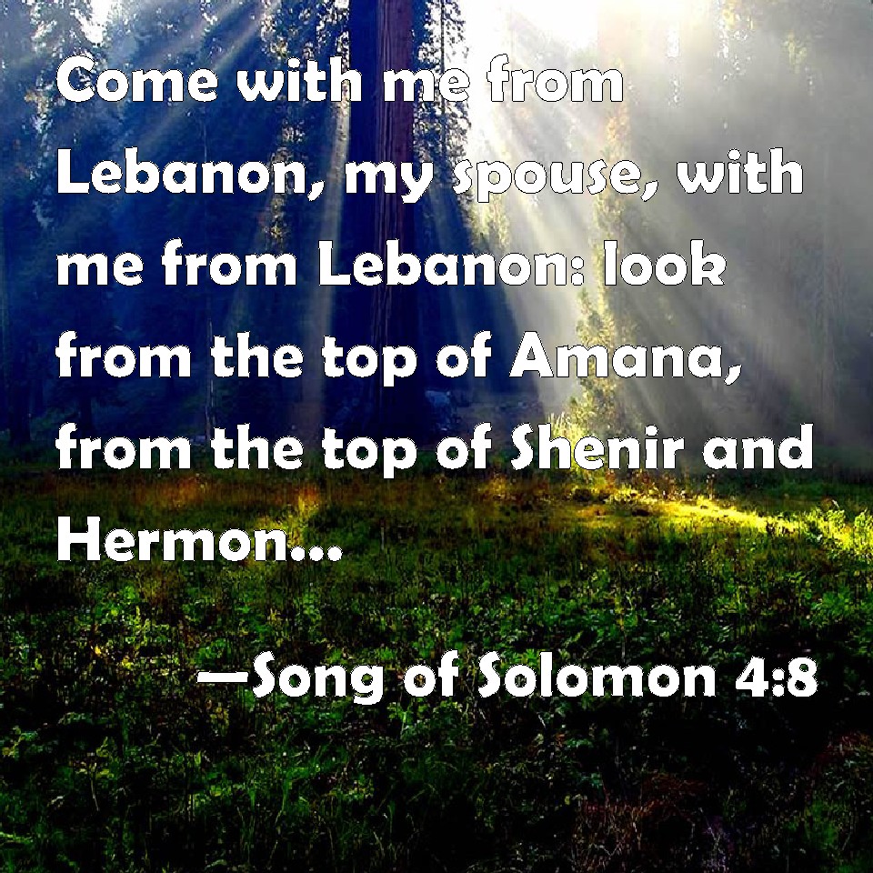 Choose a Background Song of Solomon 4:8 Come with me from Lebanon, my spouse, with me from Lebanon: look from the top of Amana, from the top of Shenir and Hermon, from the lions' dens, from the mountains of the leopards. KJV: Come with me from Lebanon, my spouse, with me from Lebanon: look from the top of Amana, from the top of Shenir and Hermon, from the lions' dens, from the mountains of the leopards. DRB: Come from Libanus, my spouse, come from Libanus, come: thou shalt be crowned from the top of Amana, from the top of Sanir and Hermon, from the dens of the lions, from the mountains of the leopards. DBT: Come with me, from Lebanon, my spouse, With me from Lebanon, Come, look from the top of Amanah, From the top of Senir and Hermon, From the lions' dens, From the mountains of the leopards. ERV: Come with me from Lebanon, my bride, with me from Lebanon: look from the top of Amana, from the top of Senir and Hermon, from the lions' dens, from the mountains of the leopards. WBT: Come with me from Lebanon, my spouse, with me from Lebanon: look from the top of Amana, from the top of Shenir and Hermon, from the lions' dens, from the mountains of the leopards. WEB: Come with me from Lebanon, my bride, with me from Lebanon. Look from the top of Amana, from the top of Senir and Hermon, from the lions' dens, from the mountains of the leopards. YLT: Come from Lebanon, come thou in. Look from the top of Amana, From the top of Shenir and Hermon, From the habitations of lions, From the mountains of leopards.Links Song of Solomon 4:8 NIV • Song of Solomon 4:8 NLT • Song of Solomon 4:8 ESV • Song of Solomon 4:8 NASB • Song of Solomon 4:8 KJV • Song of Solomon 4:8 Interlinear • Song of Solomon 4:8 Commentaries • Song of Solomon 4:8 Parallel Texts • Song of Solomon 4:8 Bible Apps • Song of Solomon 4:8 Parallel • Bible Hub |