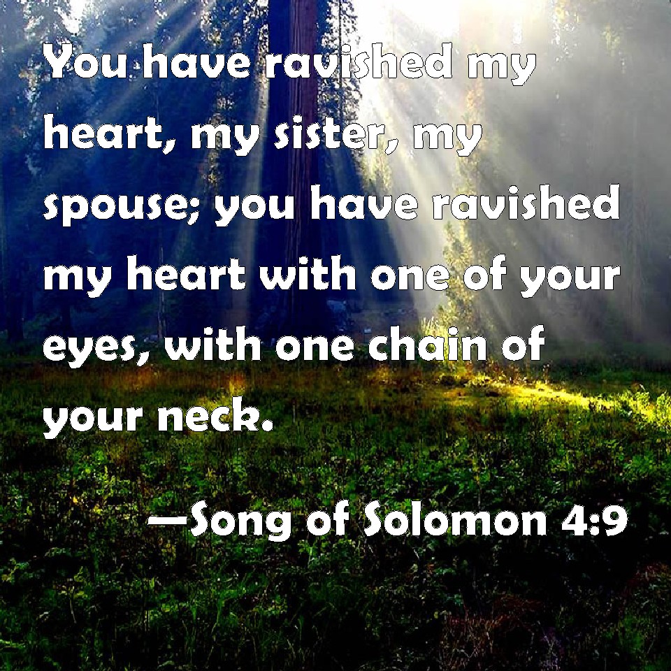 Choose a Background Song of Solomon 4:9 You have ravished my heart, my sister, my spouse; you have ravished my heart with one of your eyes, with one chain of your neck. KJV: Thou hast ravished my heart, my sister, my spouse; thou hast ravished my heart with one of thine eyes, with one chain of thy neck. DRB: Thou hast wounded my heart, my sister, my spouse, thou hast wounded my heart with one of thy eyes, and with one hair of thy neck. DBT: Thou hast ravished my heart, my sister, my spouse; Thou hast ravished my heart with one of thine eyes, With one chain of thy neck. ERV: Thou hast ravished my heart, my sister, my bride; thou hast ravished my heart with one of thine eyes, with one chain of thy neck. WBT: Thou hast ravished my heart, my sister, my spouse; thou hast ravished my heart with one of thy eyes, with one chain of thy neck. WEB: You have ravished my heart, my sister, my bride. You have ravished my heart with one of your eyes, with one chain of your neck. YLT: Thou hast emboldened me, my sister-spouse, Emboldened me with one of thine eyes, With one chain of thy neck.Links Song of Solomon 4:9 NIV • Song of Solomon 4:9 NLT • Song of Solomon 4:9 ESV • Song of Solomon 4:9 NASB • Song of Solomon 4:9 KJV • Song of Solomon 4:9 Interlinear • Song of Solomon 4:9 Commentaries • Song of Solomon 4:9 Parallel Texts • Song of Solomon 4:9 Bible Apps • Song of Solomon 4:9 Parallel • Bible Hub |