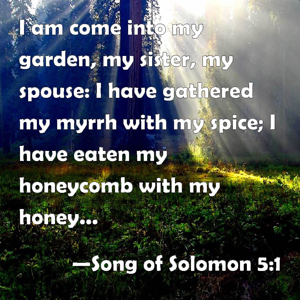 Choose a Background Song of Solomon 5:1 I am come into my garden, my sister, my spouse: I have gathered my myrrh with my spice; I have eaten my honeycomb with my honey; I have drunk my wine with my milk: eat, O friends; drink, yes, drink abundantly, O beloved. KJV: I am come into my garden, my sister, my spouse: I have gathered my myrrh with my spice; I have eaten my honeycomb with my honey; I have drunk my wine with my milk: eat, O friends; drink, yea, drink abundantly, O beloved. DRB: Let my beloved come into his garden, and eat the fruit of his apple trees. I am come into my garden, O my sister, my spouse, I have gathered my myrrh, with my aromatical spices: I have eaten the honeycomb with my honey, I have drunk my wine with my milk: eat, O friends, and drink, and be inebriated, my dearly beloved. DBT: I am come into my garden, my sister, my spouse; I have gathered my myrrh with my spice; I have eaten my honeycomb with my honey; I have drunk my wine with my milk. Eat, O friends; drink, yea, drink abundantly, beloved ones! ERV: I AM come into my garden, my sister, my bride: I have gathered my myrrh with my spice; I have eaten my honeycomb with my honey; I have drunk my wine with my milk. Eat, O friends; drink, yea, drink abundantly, O beloved. WBT: I have come into my garden, my sister, my spouse: I have gathered my myrrh, with my spice; I have eaten my honey-comb with my honey; I have drank my wine with my milk: eat, O friends; drink, yes, drink abundantly, O beloved. WEB: I have come into my garden, my sister, my bride. I have gathered my myrrh with my spice; I have eaten my honeycomb with my honey; I have drunk my wine with my milk. Friends Eat, friends! Drink, yes, drink abundantly, beloved. Beloved YLT: I have come in to my garden, my sister-spouse, I have plucked my myrrh with my spice, I have eaten my comb with my honey, I have drunk my wine with my milk. Eat, O friends, drink, Yea, drink abundantly, O beloved ones!Links Song of Solomon 5:1 NIV • Song of Solomon 5:1 NLT • Song of Solomon 5:1 ESV • Song of Solomon 5:1 NASB • Song of Solomon 5:1 KJV • Song of Solomon 5:1 Interlinear • Song of Solomon 5:1 Commentaries • Song of Solomon 5:1 Parallel Texts • Song of Solomon 5:1 Bible Apps • Song of Solomon 5:1 Parallel • Bible Hub |