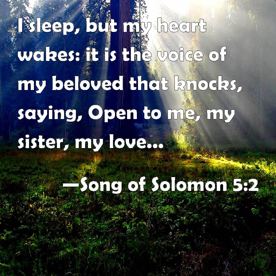 Choose a Background Song of Solomon 5:2 I sleep, but my heart wakes: it is the voice of my beloved that knocks, saying, Open to me, my sister, my love, my dove, my undefiled: for my head is filled with dew, and my locks with the drops of the night. KJV: I sleep, but my heart waketh: it is the voice of my beloved that knocketh, saying, Open to me, my sister, my love, my dove, my undefiled: for my head is filled with dew, and my locks with the drops of the night. DRB: I sleep, and my heart watcheth; the voice of my beloved knocking: Open to me, my sister, my love, my dove, my undefiled: for my head is full of dew, and my locks of the drops of the nights. DBT: I slept, but my heart was awake. The voice of my beloved! he knocketh: Open to me, my sister, my love, my dove, mine undefiled; For my head is filled with dew, My locks with the drops of the night. ERV: I was asleep, but my heart waked: it is the voice of my beloved that knocketh, saying, Open to me, my sister, my love, my dove, my undefiled: for my head is filled with dew, my locks with the drops of the night. WBT: I sleep, but my heart waketh: it is the voice of my beloved that knocketh, saying, Open to me, my sister, my love, my dove, my undefiled: for my head is filled with dew, and my locks with the drops of the night. WEB: I was asleep, but my heart was awake. It is the voice of my beloved who knocks: "Open to me, my sister, my love, my dove, my undefiled; for my head is filled with dew, and my hair with the dampness of the night." YLT: I am sleeping, but my heart waketh: The sound of my beloved knocking! 'Open to me, my sister, my friend, My dove, my perfect one, For my head is filled with dew, My locks with drops of the night.'Links Song of Solomon 5:2 NIV • Song of Solomon 5:2 NLT • Song of Solomon 5:2 ESV • Song of Solomon 5:2 NASB • Song of Solomon 5:2 KJV • Song of Solomon 5:2 Interlinear • Song of Solomon 5:2 Commentaries • Song of Solomon 5:2 Parallel Texts • Song of Solomon 5:2 Bible Apps • Song of Solomon 5:2 Parallel • Bible Hub |