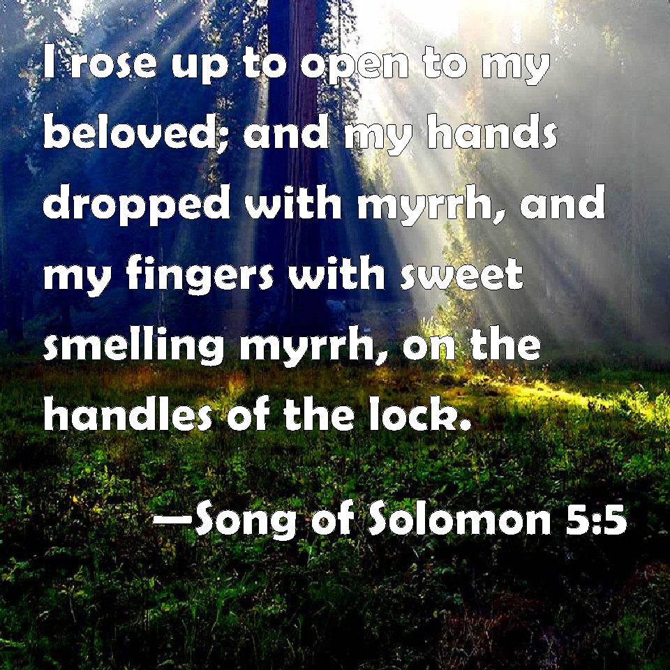 Choose a Background Song of Solomon 5:5 I rose up to open to my beloved; and my hands dropped with myrrh, and my fingers with sweet smelling myrrh, on the handles of the lock. KJV: I rose up to open to my beloved; and my hands dropped with myrrh, and my fingers with sweet smelling myrrh, upon the handles of the lock. DRB: I arose up to open to my beloved: my hands dropped with myrrh, and my fingers were full of the choicest myrrh. DBT: I rose up to open to my beloved; And my hands dropped with myrrh, And my fingers with liquid myrrh, Upon the handles of the lock. ERV: I rose up to open to my beloved; and my hands dropped with myrrh, and my fingers with liquid myrrh, upon the handles of the bolt. WBT: I rose up to open to my beloved: and my hands dropped with myrrh, and my fingers with sweet-smelling myrrh, upon the handles of the lock. WEB: I rose up to open for my beloved. My hands dripped with myrrh, my fingers with liquid myrrh, on the handles of the lock. YLT: I rose to open to my beloved, And my hands dropped myrrh, Yea, my fingers flowing myrrh, On the handles of the lock.Links Song of Solomon 5:5 NIV • Song of Solomon 5:5 NLT • Song of Solomon 5:5 ESV • Song of Solomon 5:5 NASB • Song of Solomon 5:5 KJV • Song of Solomon 5:5 Interlinear • Song of Solomon 5:5 Commentaries • Song of Solomon 5:5 Parallel Texts • Song of Solomon 5:5 Bible Apps • Song of Solomon 5:5 Parallel • Bible Hub |