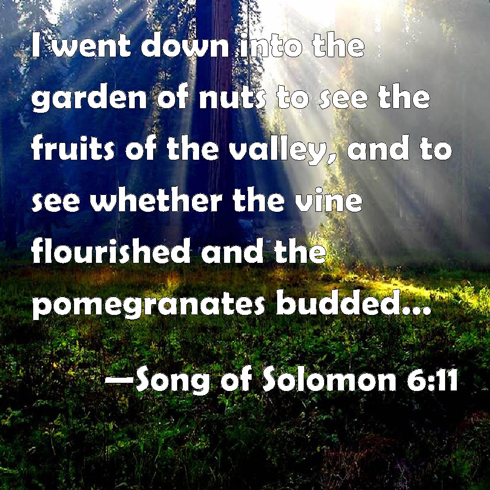 Choose a Background Song of Solomon 6:11 I went down into the garden of nuts to see the fruits of the valley, and to see whether the vine flourished and the pomegranates budded. KJV: I went down into the garden of nuts to see the fruits of the valley, and to see whether the vine flourished, and the pomegranates budded. DRB: I went down into the garden of nuts, to see the fruits of the valleys, and to look if the vineyard had flourished, and the pomegranates budded. DBT: I went down into the garden of nuts, To see the verdure of the valley, To see whether the vine budded, Whether the pomegranates blossomed. ERV: I went down into the garden of nuts, to see the green plants of the valley, to see whether the vine budded, and the pomegranates were in flower. WBT: I went down into the garden of nuts to see the fruits of the valley, and to see whether the vine flourished, and the pomegranates budded. WEB: I went down into the nut tree grove, to see the green plants of the valley, to see whether the vine budded, and the pomegranates were in flower. YLT: Unto a garden of nuts I went down, To look on the buds of the valley, To see whither the vine had flourished, The pomegranates had blossomed — Links Song of Solomon 6:11 NIV • Song of Solomon 6:11 NLT • Song of Solomon 6:11 ESV • Song of Solomon 6:11 NASB • Song of Solomon 6:11 KJV • Song of Solomon 6:11 Interlinear • Song of Solomon 6:11 Commentaries • Song of Solomon 6:11 Parallel Texts • Song of Solomon 6:11 Bible Apps • Song of Solomon 6:11 Parallel • Bible Hub |