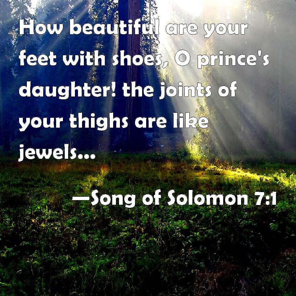 Choose a Background Song of Solomon 7:1 How beautiful are your feet with shoes, O prince's daughter! the joints of your thighs are like jewels, the work of the hands of a cunning workman. KJV: How beautiful are thy feet with shoes, O prince's daughter! the joints of thy thighs are like jewels, the work of the hands of a cunning workman. DRB: What shalt thou see in the Sulamitess but the companies of camps? How beautiful are thy steps in shoes, O prince's daughter! The joints of thy thighs are like jewels, that are made by the hand of a skilful workman. DBT: How beautiful are thy footsteps in sandals, O prince's daughter! The roundings of thy thighs are like jewels, The work of the hands of an artist. ERV: How beautiful are thy feet in sandals, O prince's daughter! the joints of thy thighs are like jewels, the work of the hands of a cunning workman. WBT: How beautiful are thy feet with shoes, O prince's daughter! the joints of thy thighs are like jewels, the work of the hands of a skillful workman. WEB: How beautiful are your feet in sandals, prince's daughter! Your rounded thighs are like jewels, the work of the hands of a skillful workman. YLT: As the chorus of 'Mahanaim.' How beautiful were thy feet with sandals, O daughter of Nadib. The turnings of thy sides are as ornaments, Work of the hands of an artificer.Links Song of Solomon 7:1 NIV • Song of Solomon 7:1 NLT • Song of Solomon 7:1 ESV • Song of Solomon 7:1 NASB • Song of Solomon 7:1 KJV • Song of Solomon 7:1 Interlinear • Song of Solomon 7:1 Commentaries • Song of Solomon 7:1 Parallel Texts • Song of Solomon 7:1 Bible Apps • Song of Solomon 7:1 Parallel • Bible Hub |