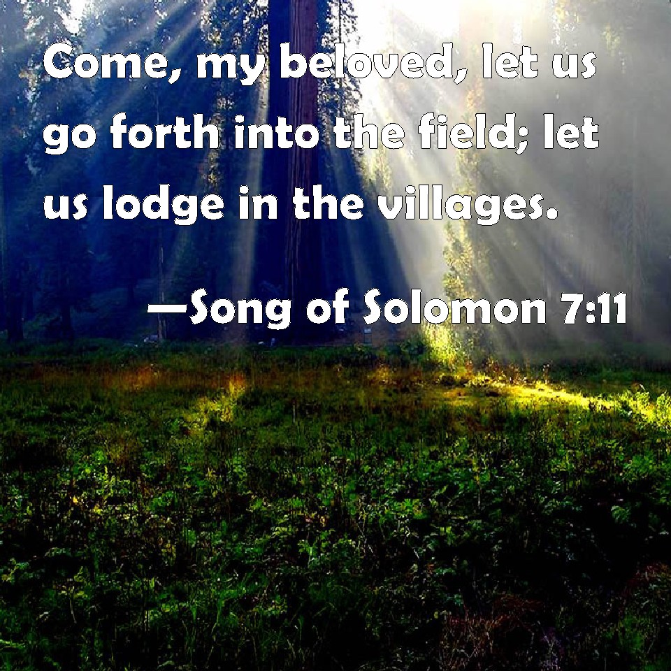 Choose a Background Song of Solomon 7:11 Come, my beloved, let us go forth into the field; let us lodge in the villages. KJV: Come, my beloved, let us go forth into the field; let us lodge in the villages. DRB: Come, my beloved, let us go forth into the field, let us abide in the villages. DBT: Come, my beloved, let us go forth into the fields; Let us lodge in the villages. ERV: Come, my beloved, let us go forth into the field; let us lodge in the villages. WBT: Come, my beloved, let us go forth into the field; let us lodge in the villages. WEB: Come, my beloved, let us go forth into the field. Let us lodge in the villages. YLT: Come, my beloved, we go forth to the field,Links Song of Solomon 7:11 NIV • Song of Solomon 7:11 NLT • Song of Solomon 7:11 ESV • Song of Solomon 7:11 NASB • Song of Solomon 7:11 KJV • Song of Solomon 7:11 Interlinear • Song of Solomon 7:11 Commentaries • Song of Solomon 7:11 Parallel Texts • Song of Solomon 7:11 Bible Apps • Song of Solomon 7:11 Parallel • Bible Hub |
