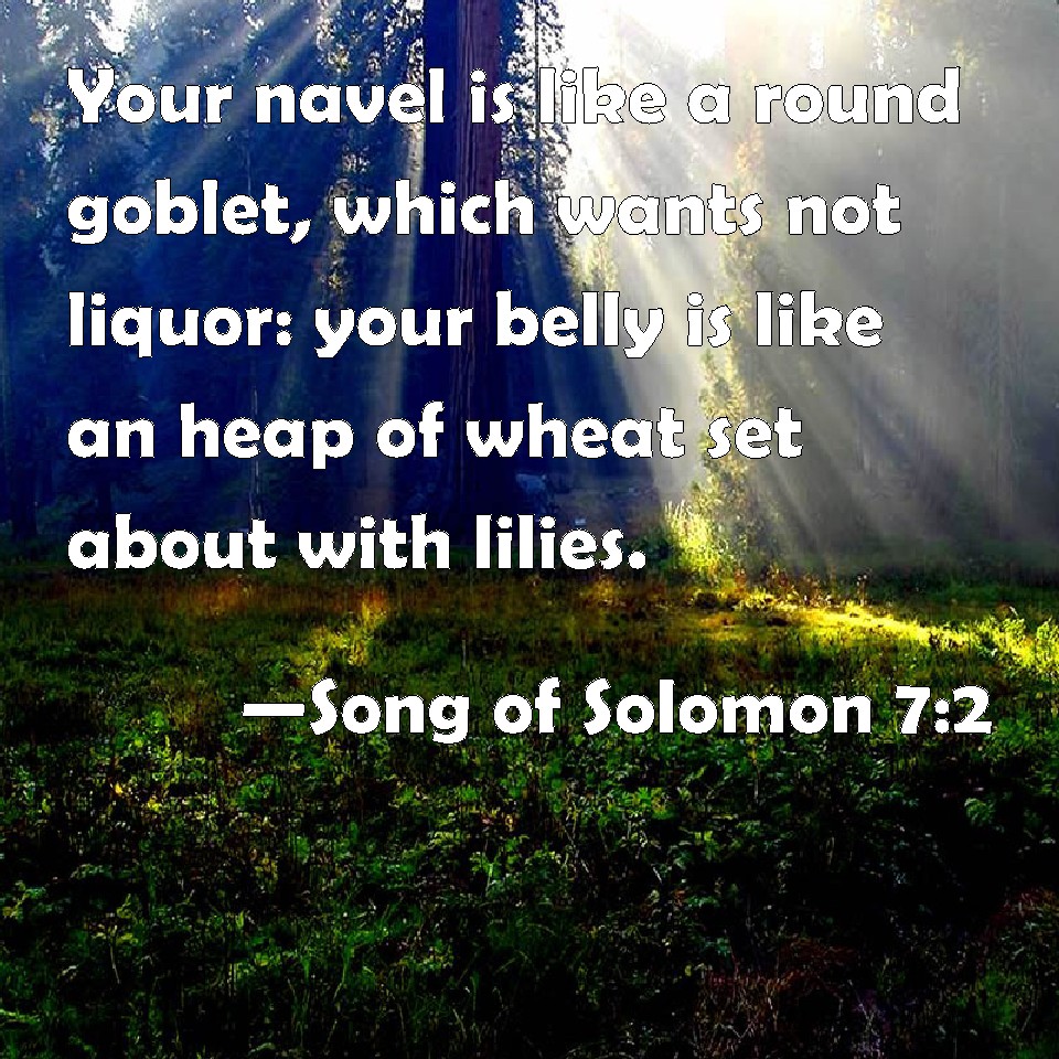 Choose a Background Song of Solomon 7:2 Your navel is like a round goblet, which wants not liquor: your belly is like an heap of wheat set about with lilies. KJV: Thy navel is like a round goblet, which wanteth not liquor: thy belly is like an heap of wheat set about with lilies. DRB: Thy navel is like a round bowl never wanting cups. Thy belly is like a heap of wheat, set about with lilies. DBT: Thy navel is a round goblet, which wanteth not mixed wine; Thy belly a heap of wheat, set about with lilies; ERV: Thy navel is like a round goblet, wherein no mingled wine is wanting: thy belly is like an heap of wheat set about with lilies. WBT: Thy navel is like a round goblet, which wanteth not liquor: thy belly is like a heap of wheat set about with lilies. WEB: Your body is like a round goblet, no mixed wine is wanting. Your waist is like a heap of wheat, set about with lilies. YLT: Thy waist is a basin of roundness, It lacketh not the mixture, Thy body a heap of wheat, fenced with lilies,Links Song of Solomon 7:2 NIV • Song of Solomon 7:2 NLT • Song of Solomon 7:2 ESV • Song of Solomon 7:2 NASB • Song of Solomon 7:2 KJV • Song of Solomon 7:2 Interlinear • Song of Solomon 7:2 Commentaries • Song of Solomon 7:2 Parallel Texts • Song of Solomon 7:2 Bible Apps • Song of Solomon 7:2 Parallel • Bible Hub |