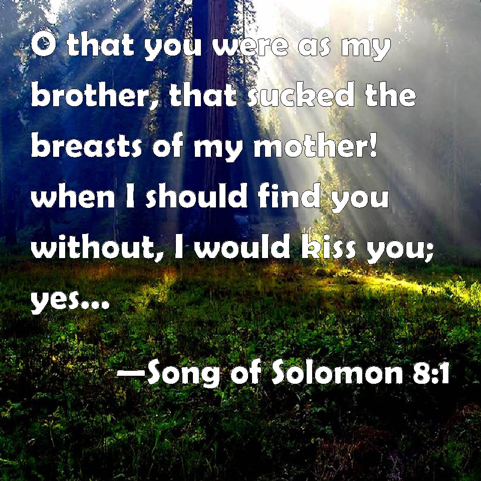 Choose a Background Song of Solomon 8:1 O that you were as my brother, that sucked the breasts of my mother! when I should find you without, I would kiss you; yes, I should not be despised. KJV: O that thou wert as my brother, that sucked the breasts of my mother! when I should find thee without, I would kiss thee; yea, I should not be despised. DRB: Who shall give thee to me for my brother, sucking the breasts of my mother, that I may find thee without, and kiss thee, and now no man may despise me? DBT: Oh that thou wert as my brother, That sucked the breasts of my mother! Should I find thee without, I would kiss thee; And they would not despise me. ERV: Oh that thou wert as my brother, that sucked the breasts of my mother! when I should find thee without, I would kiss thee; yea, and none would despise me. WBT: O that thou wert as my brother, that was nourished at the breasts of my mother! when I should find thee without, I would kiss thee; yes, I should not be despised. WEB: Oh that you were like my brother, who nursed from the breasts of my mother! If I found you outside, I would kiss you; yes, and no one would despise me. YLT: Who doth make thee as a brother to me, Sucking the breasts of my mother? I find thee without, I kiss thee, Yea, they do not despise me,Links Song of Solomon 8:1 NIV • Song of Solomon 8:1 NLT • Song of Solomon 8:1 ESV • Song of Solomon 8:1 NASB • Song of Solomon 8:1 KJV • Song of Solomon 8:1 Interlinear • Song of Solomon 8:1 Commentaries • Song of Solomon 8:1 Parallel Texts • Song of Solomon 8:1 Bible Apps • Song of Solomon 8:1 Parallel • Bible Hub |