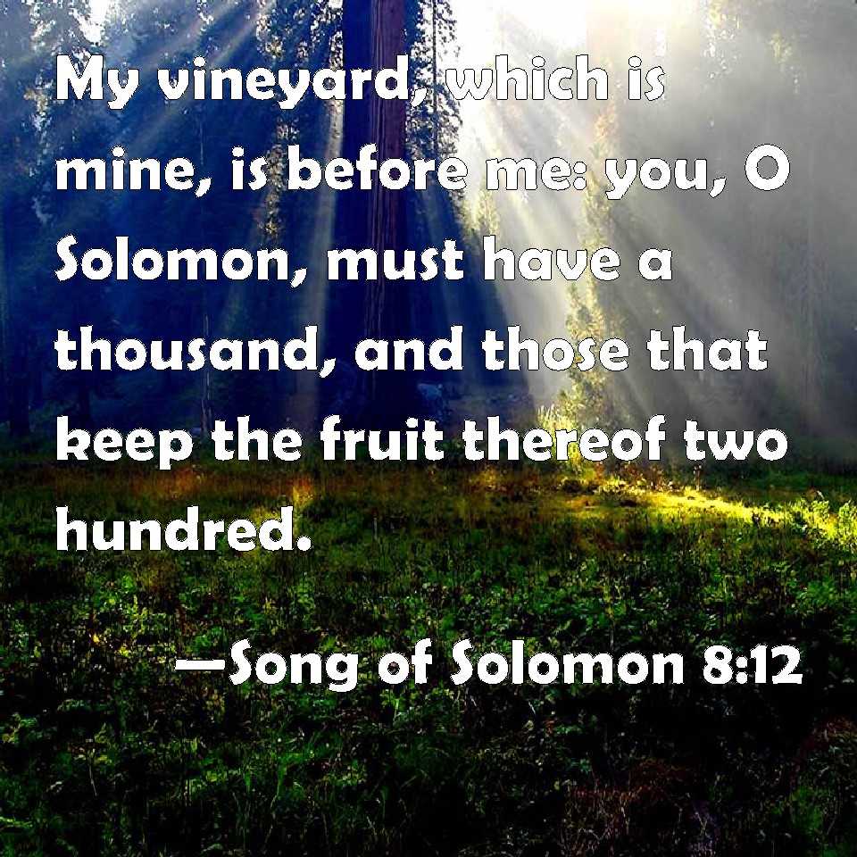 Choose a Background Song of Solomon 8:12 My vineyard, which is mine, is before me: you, O Solomon, must have a thousand, and those that keep the fruit thereof two hundred. KJV: My vineyard, which is mine, is before me: thou, O Solomon, must have a thousand, and those that keep the fruit thereof two hundred. DRB: My vineyard is before me. A thousand are for thee, the peaceable, and two hundred for them that keep the fruit thereof. DBT: My vineyard, which is mine, is before me: The thousand silver-pieces be to thee, Solomon; And to the keepers of its fruit, two hundred. ERV: My vineyard, which is mine, is before me: thou, O Solomon, shalt have the thousand, and those that keep the fruit thereof two hundred. WBT: My vineyard which is mine, is before me: thou, O Solomon, must have a thousand, and those that keep the fruit of it two hundred. WEB: My own vineyard is before me. The thousand are for you, Solomon; two hundred for those who tend its fruit. Lover YLT: My vineyard — my own — is before me, The thousand is for thee, O Solomon. And the two hundred for those keeping its fruit. O dweller in gardens!Links Song of Solomon 8:12 NIV • Song of Solomon 8:12 NLT • Song of Solomon 8:12 ESV • Song of Solomon 8:12 NASB • Song of Solomon 8:12 KJV • Song of Solomon 8:12 Interlinear • Song of Solomon 8:12 Commentaries • Song of Solomon 8:12 Parallel Texts • Song of Solomon 8:12 Bible Apps • Song of Solomon 8:12 Parallel • Bible Hub |