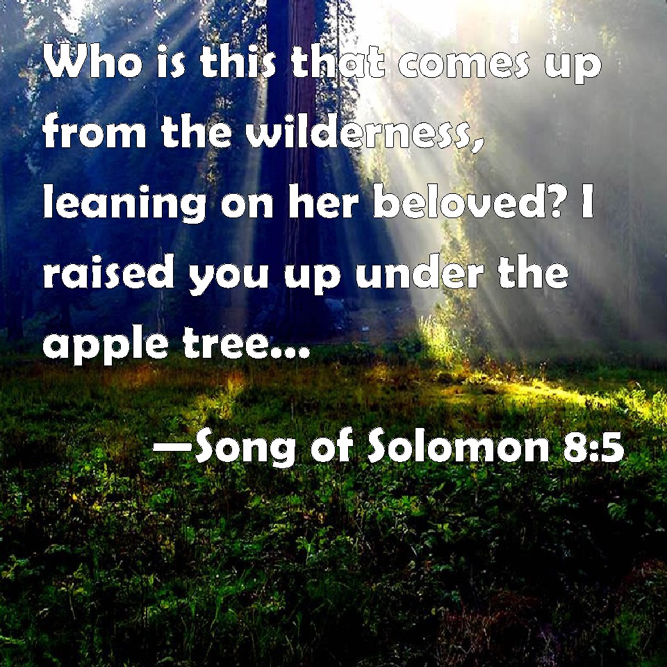 Choose a Background Song of Solomon 8:5 Who is this that comes up from the wilderness, leaning on her beloved? I raised you up under the apple tree: there your mother brought you forth: there she brought you forth that bore you. KJV: Who is this that cometh up from the wilderness, leaning upon her beloved? I raised thee up under the apple tree: there thy mother brought thee forth: there she brought thee forth that bare thee. DRB: Who is this that cometh up from the desert, flowing with delights, leaning upon her beloved? Under the apple tree I raised thee up: there thy mother was corrupted, there she was defloured that bore thee. DBT: Who is this that cometh up from the wilderness, Leaning upon her beloved? I awoke thee under the apple-tree: There thy mother brought thee forth; There she brought thee forth that bore thee. ERV: Who is this that cometh up from the wilderness, leaning upon her beloved? Under the apple tree I awakened thee: there thy mother was in travail with thee, there was she in travail that brought thee forth. WBT: Who is this that cometh up from the wilderness, leaning upon her beloved? I raised thee up under the apple-tree: there thy mother brought thee forth: there she brought thee forth that bore thee. WEB: Who is this who comes up from the wilderness, leaning on her beloved? Under the apple tree I aroused you. There your mother conceived you. There she was in labor and bore you. YLT: Who is this coming from the wilderness, Hasting herself for her beloved? Under the citron-tree I have waked thee, There did thy mother pledge thee, There she gave a pledge that bare thee.Links Song of Solomon 8:5 NIV • Song of Solomon 8:5 NLT • Song of Solomon 8:5 ESV • Song of Solomon 8:5 NASB • Song of Solomon 8:5 KJV • Song of Solomon 8:5 Interlinear • Song of Solomon 8:5 Commentaries • Song of Solomon 8:5 Parallel Texts • Song of Solomon 8:5 Bible Apps • Song of Solomon 8:5 Parallel • Bible Hub |