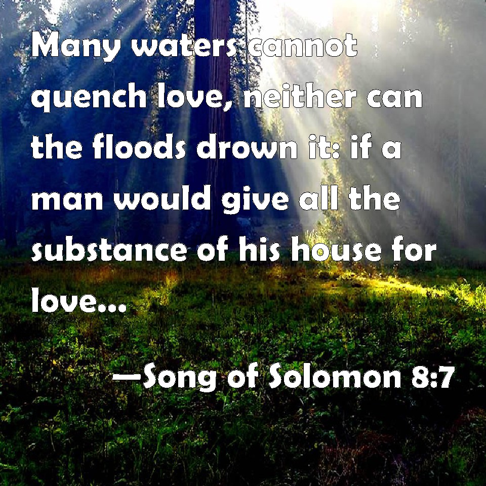 Choose a Background Song of Solomon 8:7 Many waters cannot quench love, neither can the floods drown it: if a man would give all the substance of his house for love, it would utterly be contemned. KJV: Many waters cannot quench love, neither can the floods drown it: if a man would give all the substance of his house for love, it would utterly be contemned. DRB: Many waters cannot quench charity, neither can the floods drown it: if a man should give all the substance of his house for love, he shall despise it as nothing. DBT: Many waters cannot quench love, Neither do the floods drown it: Even if a man gave all the substance of his house for love, It would utterly be contemned. ERV: Many waters cannot quench love, neither can the floods drown it: if a man would give all the substance of his house for love, he would utterly be contemned. WBT: Many waters cannot quench love, neither can the floods drown it: if a man would give all the substance of his house for love, it would utterly be contemned. WEB: Many waters can't quench love, neither can floods drown it. If a man would give all the wealth of his house for love, he would be utterly scorned. Friends YLT: Many waters are not able to quench the love, And floods do not wash it away. If one give all the wealth of his house for love, Treading down — they tread upon it.Links Song of Solomon 8:7 NIV • Song of Solomon 8:7 NLT • Song of Solomon 8:7 ESV • Song of Solomon 8:7 NASB • Song of Solomon 8:7 KJV • Song of Solomon 8:7 Interlinear • Song of Solomon 8:7 Commentaries • Song of Solomon 8:7 Parallel Texts • Song of Solomon 8:7 Bible Apps • Song of Solomon 8:7 Parallel • Bible Hub |