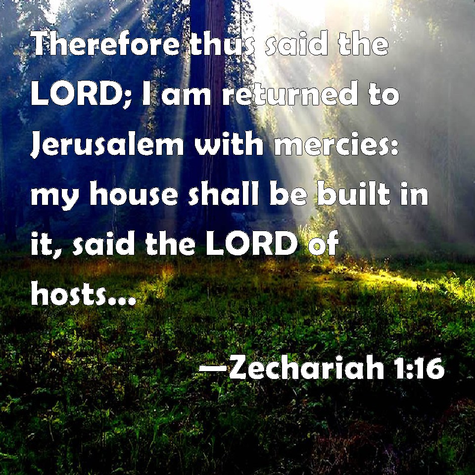 Choose a Background Zechariah 1:16 Therefore thus said the LORD; I am returned to Jerusalem with mercies: my house shall be built in it, said the LORD of hosts, and a line shall be stretched forth on Jerusalem. KJV: Therefore thus saith the LORD; I am returned to Jerusalem with mercies: my house shall be built in it, saith the LORD of hosts, and a line shall be stretched forth upon Jerusalem. DRB: Therefore thus saith the Lord: I will return to Jerusalem in mercies: my house shall be built in it, saith the Lord of hosts: and the building line shall be stretched forth upon Jerusalem. DBT: Therefore thus saith Jehovah: I am returned to Jerusalem with mercies: my house shall be built in it, saith Jehovah of hosts, and the line shall be stretched forth upon Jerusalem. ERV: Therefore thus saith the LORD: I am returned to Jerusalem with mercies; my house shall be built in it, saith the LORD of hosts, and a line shall be stretched forth over Jerusalem. WBT: Therefore thus saith the LORD; I have returned to Jerusalem with mercies: my house shall be built in it, saith the LORD of hosts, and a line shall be stretched forth upon Jerusalem. WEB: Therefore thus says Yahweh: "I have returned to Jerusalem with mercy. My house shall be built in it," says Yahweh of Armies, "and a line shall be stretched forth over Jerusalem."' YLT: Therefore, thus said Jehovah: I have turned to Jerusalem with mercies, My house is built in it, An affirmation of Jehovah of Hosts, And a line is stretched over Jerusalem.Links Zechariah 1:16 NIV • Zechariah 1:16 NLT • Zechariah 1:16 ESV • Zechariah 1:16 NASB • Zechariah 1:16 KJV • Zechariah 1:16 Interlinear • Zechariah 1:16 Commentaries • Zechariah 1:16 Parallel Texts • Zechariah 1:16 Bible Apps • Zechariah 1:16 Parallel • Bible Hub |