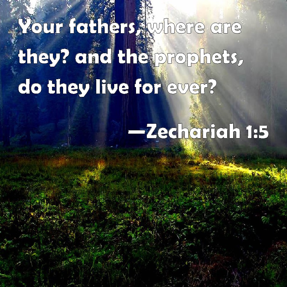 Choose a Background Zechariah 1:5 Your fathers, where are they? and the prophets, do they live for ever? KJV: Your fathers, where are they? and the prophets, do they live for ever? DRB: Your fathers, where are they? and the prophets, shall they live always? DBT: Your fathers, where are they? and the prophets, do they live for ever? ERV: Your fathers, where are they? and the prophets, do they live for ever? WBT: Your fathers, where are they? and the prophets, do they live for ever? WEB: Your fathers, where are they? And the prophets, do they live forever? YLT: Your fathers — where are they? And the prophets — to the age do they live?Links Zechariah 1:5 NIV • Zechariah 1:5 NLT • Zechariah 1:5 ESV • Zechariah 1:5 NASB • Zechariah 1:5 KJV • Zechariah 1:5 Interlinear • Zechariah 1:5 Commentaries • Zechariah 1:5 Parallel Texts • Zechariah 1:5 Bible Apps • Zechariah 1:5 Parallel • Bible Hub |