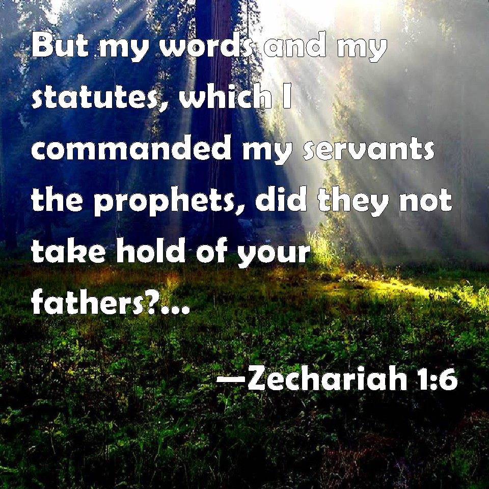 Choose a Background Zechariah 1:6 But my words and my statutes, which I commanded my servants the prophets, did they not take hold of your fathers? and they returned and said, Like as the LORD of hosts thought to do to us, according to our ways, and according to our doings, so has he dealt with us. KJV: But my words and my statutes, which I commanded my servants the prophets, did they not take hold of your fathers? and they returned and said, Like as the LORD of hosts thought to do unto us, according to our ways, and according to our doings, so hath he dealt with us. DRB: But yet my words, and my ordinances, which I gave in charge to my servants the prophets, did they not take hold of your fathers, and they returned, and said: As the Lord of hosts thought to do to us according to our ways, and according to our devices, so he hath done to us. DBT: But my words and my statutes, which I commanded my servants the prophets, did they not overtake your fathers? And they turned and said, Like as Jehovah of hosts thought to do unto us, according to our ways and according to our doings, so hath he dealt with us. ERV: But my words and my statutes, which I commanded my servants the prophets, did they not overtake your fathers? and they turned and said, Like as the LORD of hosts thought to do unto us, according to our ways, and according to our doings, so hath he dealt with us. WBT: But my words and my statutes, which I commanded my servants the prophets, did they not take hold of your fathers? and they returned and said, As the LORD of hosts thought to do to us, according to our ways, and according to our doings, so hath he dealt with us. WEB: But my words and my decrees, which I commanded my servants the prophets, didn't they overtake your fathers? "Then they repented and said, 'Just as Yahweh of Armies determined to do to us, according to our ways, and according to our practices, so he has dealt with us.'" YLT: Only, My words, and My statutes, That I commanded My servants the prophets, Have they not overtaken your fathers, And they turn back and say: As Jehovah of Hosts designed to do to us, According to our ways, and according to our doings, So He hath done to us?'Links Zechariah 1:6 NIV • Zechariah 1:6 NLT • Zechariah 1:6 ESV • Zechariah 1:6 NASB • Zechariah 1:6 KJV • Zechariah 1:6 Interlinear • Zechariah 1:6 Commentaries • Zechariah 1:6 Parallel Texts • Zechariah 1:6 Bible Apps • Zechariah 1:6 Parallel • Bible Hub |