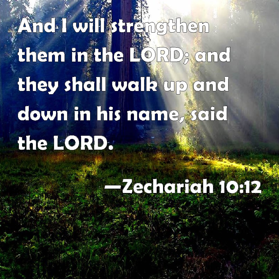 Choose a Background Zechariah 10:12 And I will strengthen them in the LORD; and they shall walk up and down in his name, said the LORD. KJV: And I will strengthen them in the LORD; and they shall walk up and down in his name, saith the LORD. DRB: I will strengthen them in the Lord, and they shall walk in his name, saith the Lord. DBT: And I will strengthen them in Jehovah; and they shall walk in his name, saith Jehovah. ERV: And I will strengthen them in the LORD; and they shall walk up and down in his name, saith the LORD. WBT: And I will strengthen them in the LORD; and they shall walk up and down in his name, saith the LORD. WEB: I will strengthen them in Yahweh; and they will walk up and down in his name," says Yahweh. YLT: And I have made them mighty in Jehovah, And in His name they walk up and down, An affirmation of Jehovah!Links Zechariah 10:12 NIV • Zechariah 10:12 NLT • Zechariah 10:12 ESV • Zechariah 10:12 NASB • Zechariah 10:12 KJV • Zechariah 10:12 Interlinear • Zechariah 10:12 Commentaries • Zechariah 10:12 Parallel Texts • Zechariah 10:12 Bible Apps • Zechariah 10:12 Parallel • Bible Hub |