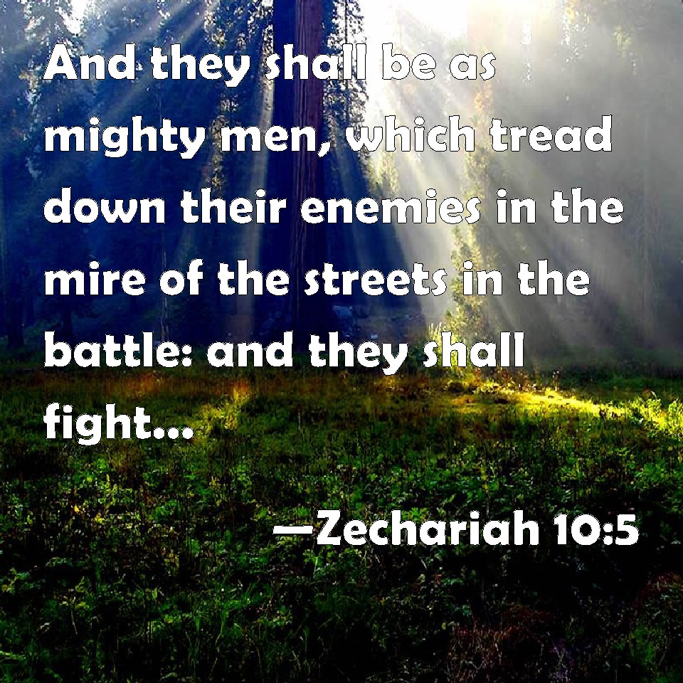 Choose a Background Zechariah 10:5 And they shall be as mighty men, which tread down their enemies in the mire of the streets in the battle: and they shall fight, because the LORD is with them, and the riders on horses shall be confounded. KJV: And they shall be as mighty men, which tread down their enemies in the mire of the streets in the battle: and they shall fight, because the LORD is with them, and the riders on horses shall be confounded. DRB: And they shall be as mighty men, treading under foot the mire of the ways in battle: and they shall fight, because the Lord is with them, and the riders of horses shall be confounded. DBT: And they shall be as mighty men, treading down the mire of the streets in the battle; and they shall fight, for Jehovah is with them, and the riders on horses shall be put to shame. ERV: And they shall be as mighty men, treading down their enemies in the mire of the streets in the battle; and they shall fight, because the LORD is with them: and the riders on horses shall be confounded. WBT: And they shall be as mighty men, who tread down their enemies in the mire of the streets in the battle: and they shall fight, because the LORD is with them, and the riders on horses shall be confounded. WEB: They shall be as mighty men, treading down muddy streets in the battle; and they shall fight, because Yahweh is with them; and the riders on horses will be confounded. YLT: And they have been as heroes, Treading in mire of out-places in battle, And they have fought, for Jehovah is with them, And have put to shame riders of horses.Links Zechariah 10:5 NIV • Zechariah 10:5 NLT • Zechariah 10:5 ESV • Zechariah 10:5 NASB • Zechariah 10:5 KJV • Zechariah 10:5 Interlinear • Zechariah 10:5 Commentaries • Zechariah 10:5 Parallel Texts • Zechariah 10:5 Bible Apps • Zechariah 10:5 Parallel • Bible Hub |