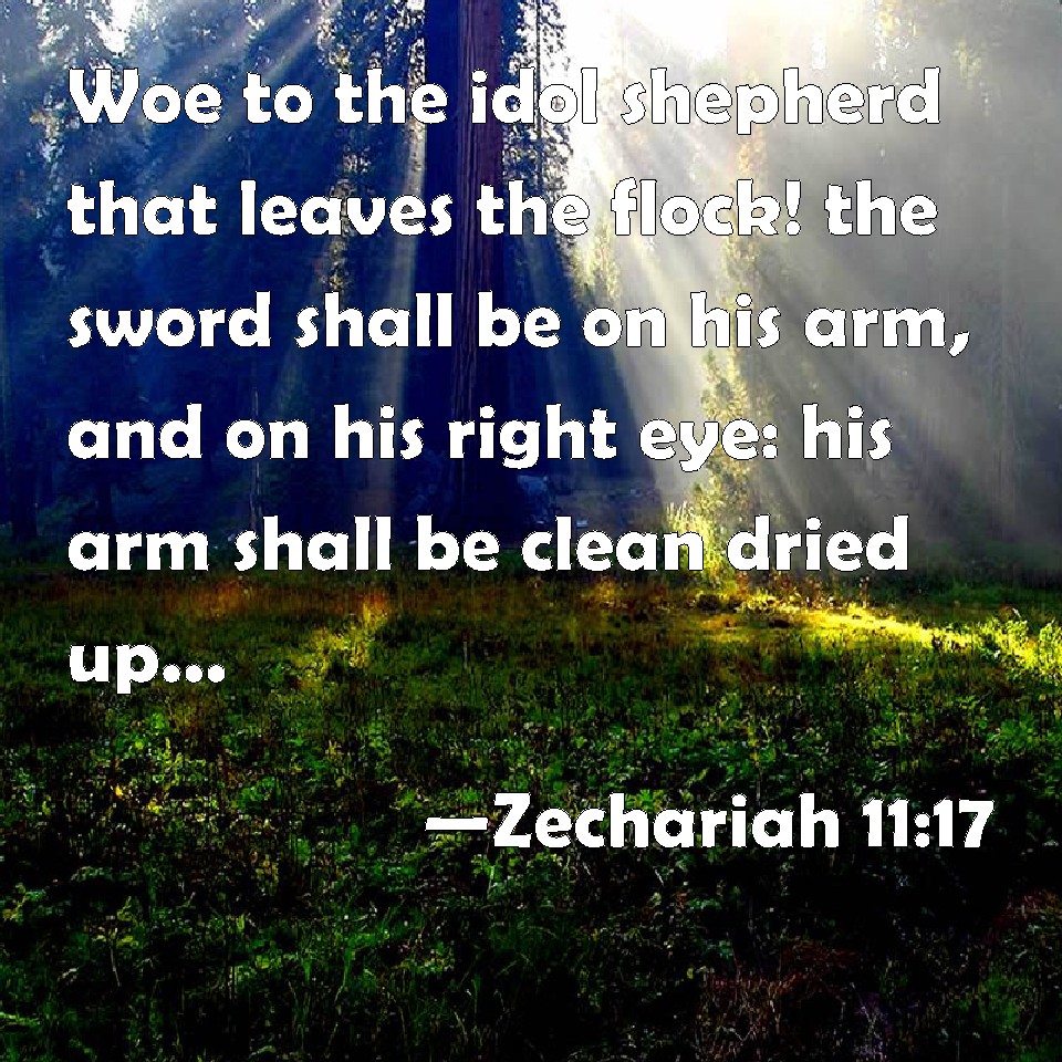 Choose a Background Zechariah 11:17 Woe to the idol shepherd that leaves the flock! the sword shall be on his arm, and on his right eye: his arm shall be clean dried up, and his right eye shall be utterly darkened. KJV: Woe to the idol shepherd that leaveth the flock! the sword shall be upon his arm, and upon his right eye: his arm shall be clean dried up, and his right eye shall be utterly darkened. DRB: O shepherd, and idol, that forsaketh the flock: the sword upon his arm and upon his right eye: his arm shall quite wither away, and his right eye shall be utterly darkened. DBT: Woe to the worthless shepherd that leaveth the flock! The sword shall be upon his arm, and upon his right eye; his arm shall be clean dried up, and his right eye utterly darkened. ERV: Woe to the worthless shepherd that leaveth the flock, the sword shall be upon his arm, and upon his right eye: his arm shall be clean dried up, and his right eye shall be utterly darkened. WBT: Woe to the idle shepherd that leaveth the flock! the sword shall be upon his arm, and upon his right eye: his arm shall be wholly dried up, and his right eye shall be utterly darkened. WEB: Woe to the worthless shepherd who leaves the flock! The sword will be on his arm, and on his right eye. His arm will be completely withered, and his right eye will be totally blinded!" YLT: Woe to the worthless shepherd, forsaking the flock, A sword is on his arm, and on his right eye, His arm is utterly dried up, And his right eye is very dim!'Links Zechariah 11:17 NIV • Zechariah 11:17 NLT • Zechariah 11:17 ESV • Zechariah 11:17 NASB • Zechariah 11:17 KJV • Zechariah 11:17 Interlinear • Zechariah 11:17 Commentaries • Zechariah 11:17 Parallel Texts • Zechariah 11:17 Bible Apps • Zechariah 11:17 Parallel • Bible Hub |