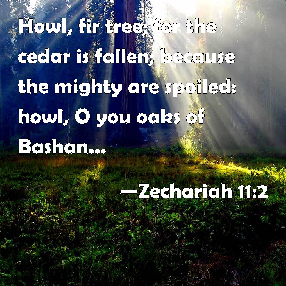Choose a Background Zechariah 11:2 Howl, fir tree; for the cedar is fallen; because the mighty are spoiled: howl, O you oaks of Bashan; for the forest of the vintage is come down. KJV: Howl, fir tree; for the cedar is fallen; because the mighty are spoiled: howl, O ye oaks of Bashan; for the forest of the vintage is come down. DRB: Howl, thou fir tree, for the cedar is fallen, for the mighty are laid waste: howl, ye oaks of Basan, because the fenced forest is cut down. DBT: Howl, cypress, for the cedar is fallen; because the noble ones are spoiled. Howl, ye oaks of Bashan; for the strong forest is come down. ERV: Howl, O fir tree, for the cedar is fallen, because the goodly ones are spoiled: howl, O ye oaks of Bashan, for the strong forest is come down. WBT: Howl, fir-tree, for the cedar is fallen; because the mighty are laid waste: howl, O ye oaks of Bashan; for the forest of the vintage is come down. WEB: Wail, fir tree, for the cedar has fallen, because the stately ones are destroyed. Wail, you oaks of Bashan, for the strong forest has come down. YLT: Howl, O fir, for fallen hath the cedar, For their honourable ones were destroyed, Howl, ye oaks of Bashan, For come down hath the fenced forest,Links Zechariah 11:2 NIV • Zechariah 11:2 NLT • Zechariah 11:2 ESV • Zechariah 11:2 NASB • Zechariah 11:2 KJV • Zechariah 11:2 Interlinear • Zechariah 11:2 Commentaries • Zechariah 11:2 Parallel Texts • Zechariah 11:2 Bible Apps • Zechariah 11:2 Parallel • Bible Hub |