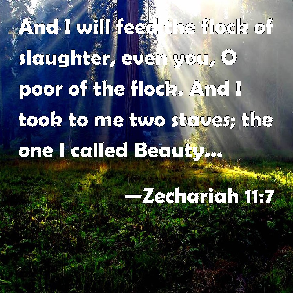 Choose a Background Zechariah 11:7 And I will feed the flock of slaughter, even you, O poor of the flock. And I took to me two staves; the one I called Beauty, and the other I called Bands; and I fed the flock. KJV: And I will feed the flock of slaughter, even you, O poor of the flock. And I took unto me two staves; the one I called Beauty, and the other I called Bands; and I fed the flock. DRB: And I will feed the hock of slaughter for this, O ye poor of the dock. And I took unto me two rods, one I called Beauty, and the other I called a Cord, and I fed the flock. DBT: So I fed the flock of slaughter, truly the poor of the flock. And I took unto me two staves; the one I called Beauty, and the other I called Bands; and I fed the flock. ERV: So I fed the flock of slaughter, verily the poor of the flock. And I took unto me two staves; the one I called Beauty, and the other I called Bands; and I fed the flock. WBT: And I will feed the flock of slaughter, even you, O poor of the flock. And I took to me two staffs; the one I called Beauty, and the other I called Bands; and I fed the flock. WEB: So I fed the flock of slaughter, especially the oppressed of the flock. I took for myself two staffs. The one I called "Favor," and the other I called "Union," and I fed the flock. YLT: And I feed the flock of slaughter, even you, ye afflicted of the flock; and I take to me two staves, the one I have called Pleasantness, and the other I have called Bands, and I feed the flock.Links Zechariah 11:7 NIV • Zechariah 11:7 NLT • Zechariah 11:7 ESV • Zechariah 11:7 NASB • Zechariah 11:7 KJV • Zechariah 11:7 Interlinear • Zechariah 11:7 Commentaries • Zechariah 11:7 Parallel Texts • Zechariah 11:7 Bible Apps • Zechariah 11:7 Parallel • Bible Hub |