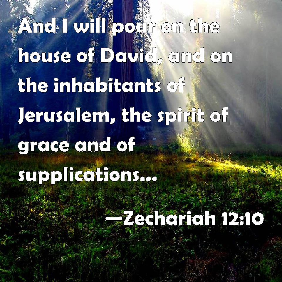 Choose a Background Zechariah 12:10 And I will pour on the house of David, and on the inhabitants of Jerusalem, the spirit of grace and of supplications: and they shall look on me whom they have pierced, and they shall mourn for him, as one mourns for his only son, and shall be in bitterness for him, as one that is in bitterness for his firstborn. KJV: And I will pour upon the house of David, and upon the inhabitants of Jerusalem, the spirit of grace and of supplications: and they shall look upon me whom they have pierced, and they shall mourn for him, as one mourneth for his only son, and shall be in bitterness for him, as one that is in bitterness for his firstborn. DRB: And I will pour out upon the house of David, and upon the inhabitants of Jerusalem, the spirit of grace, and of prayers: and they shall look upon me, whom they have pierced: and they shall mourn for him as one mourneth for an only son, and they shall grieve over him, as the manner is to grieve for the death of the firstborn. DBT: And I will pour upon the house of David and upon the inhabitants of Jerusalem the spirit of grace and of supplications; and they shall look on me whom they pierced, and they shall mourn for him, as one mourneth for an only son, and shall be in bitterness for him, as one that is in bitterness for his firstborn. ERV: And I will pour upon the house of David, and upon the inhabitants of Jerusalem, the spirit of grace and of supplication; and they shall look unto me whom they have pierced: and they shall mourn for him, as one mourneth for his only son, and shall be in bitterness for him, as one that is in bitterness for his firstborn. WBT: And I will pour upon the house of David, and upon the inhabitants of Jerusalem, the spirit of grace and of supplications: and they shall look upon me whom they have pierced, and they shall mourn for him, as one mourneth for his only son, and shall be in bitterness for him, as one that is in bitterness for his first-born. WEB: I will pour on the house of David, and on the inhabitants of Jerusalem, the spirit of grace and of supplication; and they will look to me whom they have pierced; and they shall mourn for him, as one mourns for his only son, and will grieve bitterly for him, as one grieves for his firstborn. YLT: And I have poured on the house of David, And on the inhabitant of Jerusalem, A spirit of grace and supplications, And they have looked unto Me whom they pierced, And they have mourned over it, Like a mourning over the only one, And they have been in bitterness for it, Like a bitterness over the first-born.Links Zechariah 12:10 NIV • Zechariah 12:10 NLT • Zechariah 12:10 ESV • Zechariah 12:10 NASB • Zechariah 12:10 KJV • Zechariah 12:10 Interlinear • Zechariah 12:10 Commentaries • Zechariah 12:10 Parallel Texts • Zechariah 12:10 Bible Apps • Zechariah 12:10 Parallel • Bible Hub |