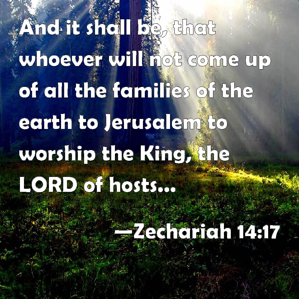 Choose a Background Zechariah 14:17 And it shall be, that whoever will not come up of all the families of the earth to Jerusalem to worship the King, the LORD of hosts, even on them shall be no rain. KJV: And it shall be, that whoso will not come up of all the families of the earth unto Jerusalem to worship the King, the LORD of hosts, even upon them shall be no rain. DRB: And it shall come to pass, that he that shall not go up of the families of the land to Jerusalem, to adore the King, the Lord of hosts, there shall be no rain upon them. DBT: And it shall be, that whoso goeth not up of the families of the earth unto Jerusalem to worship the King, Jehovah of hosts, upon them shall be no rain. ERV: And it shall be, that whoso of all the families of the earth goeth not up unto Jerusalem to worship the King, the LORD of hosts, upon them there shall be no rain. WBT: And it shall be, that whoever will not come up of all the families of the earth to Jerusalem to worship the King, the LORD of hosts, even upon them shall be no rain. WEB: It will be, that whoever of all the families of the earth doesn't go up to Jerusalem to worship the King, Yahweh of Armies, on them there will be no rain. YLT: And it hath come to pass, That he who doth not go up of the families of the land unto Jerusalem, To bow himself to the King, Jehovah of Hosts, Even on them there is no shower.Links Zechariah 14:17 NIV • Zechariah 14:17 NLT • Zechariah 14:17 ESV • Zechariah 14:17 NASB • Zechariah 14:17 KJV • Zechariah 14:17 Interlinear • Zechariah 14:17 Commentaries • Zechariah 14:17 Parallel Texts • Zechariah 14:17 Bible Apps • Zechariah 14:17 Parallel • Bible Hub |